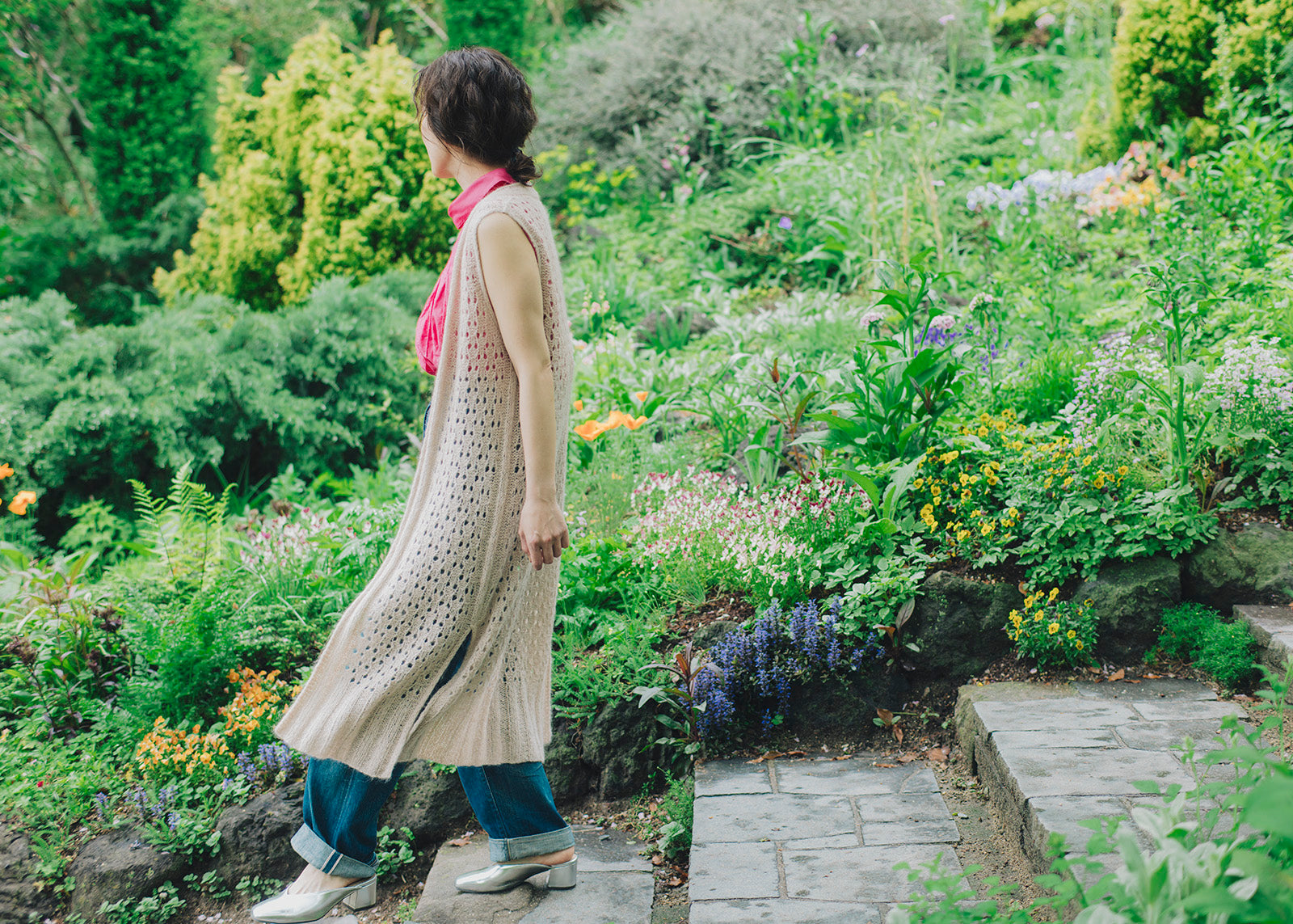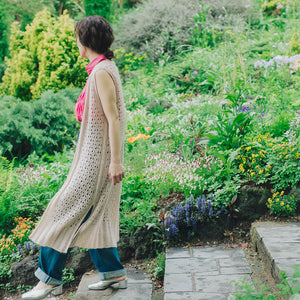 季節の変わり目にあると嬉しいレイヤードを楽しめるロングベスト。Flutterで編むのでふわふわと触り心地よく、軽くて暖か。