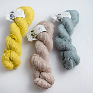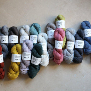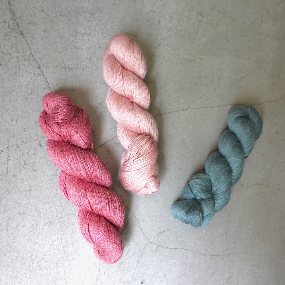 60%ウール、20%コットン、10%シルク、10%リネンの、オリジナルブレンドです。ウール多めの配合なので編みやすく、さっぱりしたウールなので、暑くなりません。コットンとリネンでひんやり涼しく、10%のシルクでほんのり光沢があります。4種類の素材が活きるようブレンドしました。
