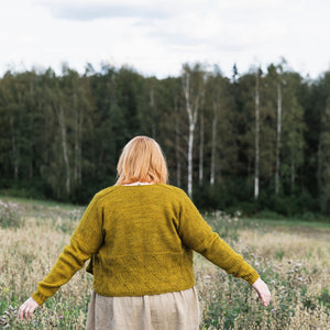ゲージ確認用のスウォッチを兼ねたポケットライナーから編み始めます。身頃は裾から脇下にかけて編み上げ、前後に分けて編み、肩をとじて仕上げます。袖は目を拾って袖口まで編んでいきます。