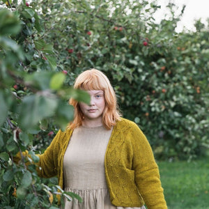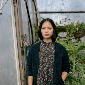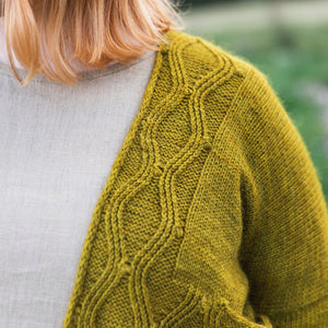 ダイヤのケーブル模様の美しいカーディガン。人気デザイナー Andrea Mowryのデザインです。Andreaらしいシンプルで洗練されたデザインで、カジュアルでもドレスアップしても着られます。一着あるだけで、様々な場面のおしゃれを楽しめそうです。