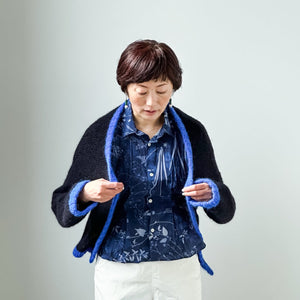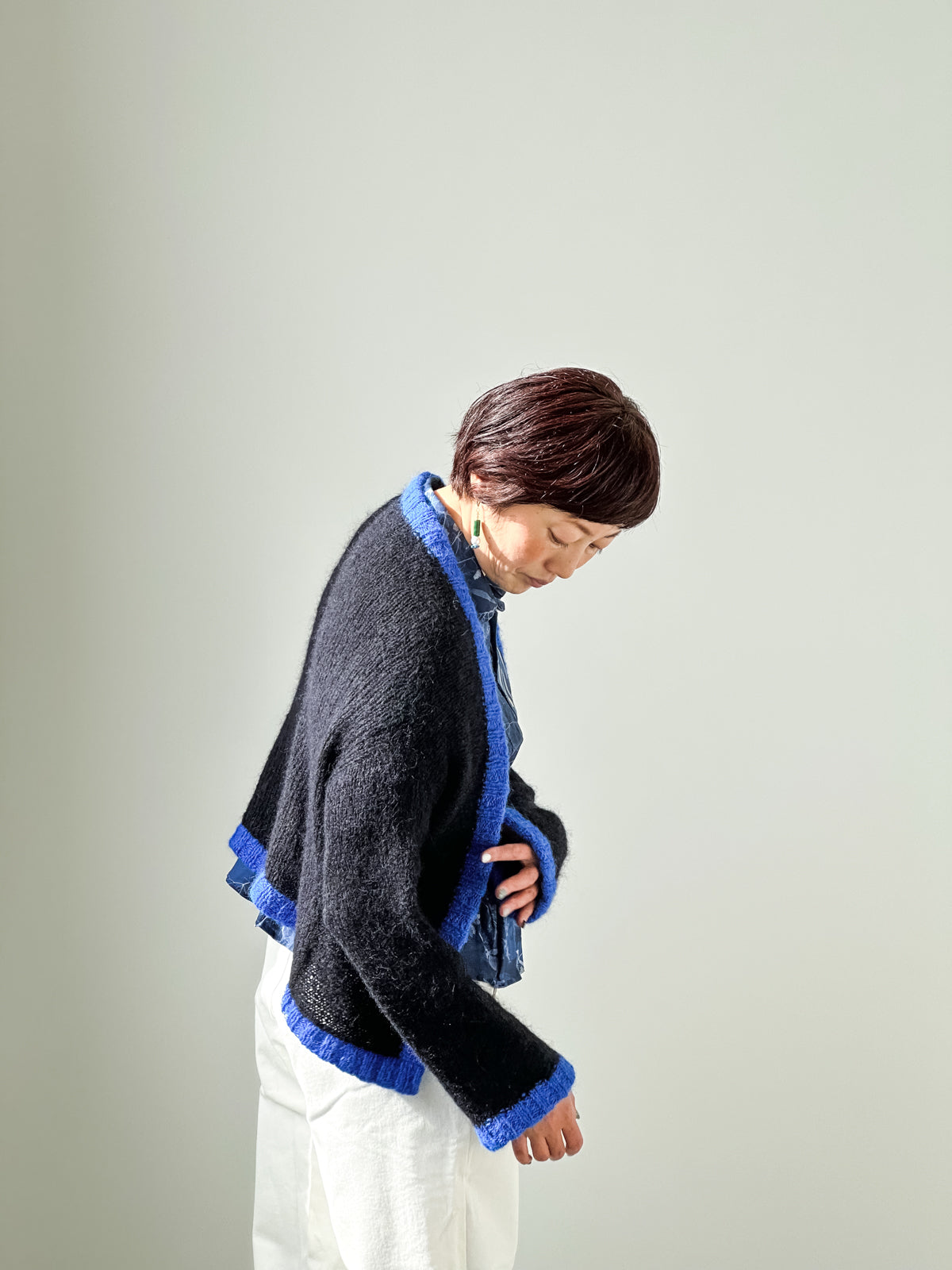 最初に後ろ身頃を往復編みで編みます。途中で袖の目を作りながら後ろ身頃の目をぐるりと拾ってから、前身頃と襟を引き返し編みで編んでいきます。袖は身頃から目を拾って袖口に向かって輪で編みます。前後身頃の裾,前立て,襟,袖口はコントラストカラーで編んで、内側に折り返してダブルに仕上げます。