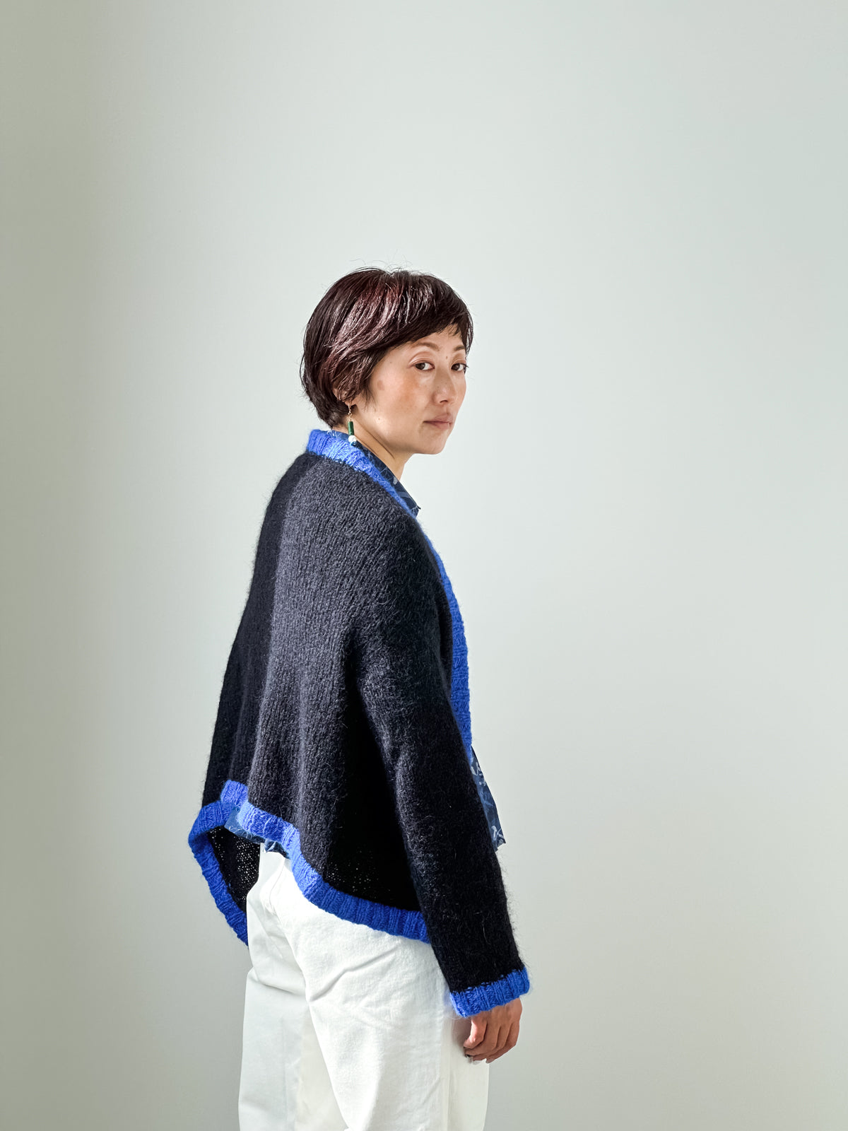 Malevichは、上下逆に着られる2wayのカーディガン。ざっくりと編んで軽く仕上げます。温かくて柔らかくて、からだを動かすと裾がふんわりと揺れます。丸くダブルに仕上げた縁も可愛く、コントラストが効いた色にするのがおすすめ。編む手順も面白くて、わくわくしながら編めそうです。