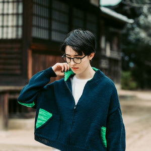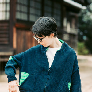 ボトムアップで編みます。ポケットを作りながら前後身頃一緒に脇下まで編みます。脇下で左右前身頃、後ろ身頃を分け、それぞれ肩まで編み、はぎ合わせます。袖はそれぞれ身頃から目を拾って引き返し編みで袖山を作りながら袖口まで編みます。襟も襟ぐりから目を拾って引き返し編みで形作りながら編み、折り返して襟ぐりにとじつけます。最後に前立てにファスナーを縫い付けます。