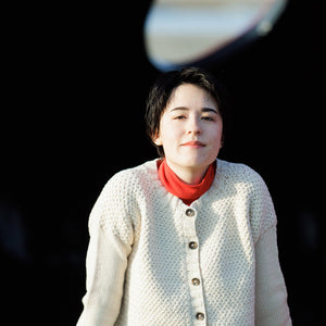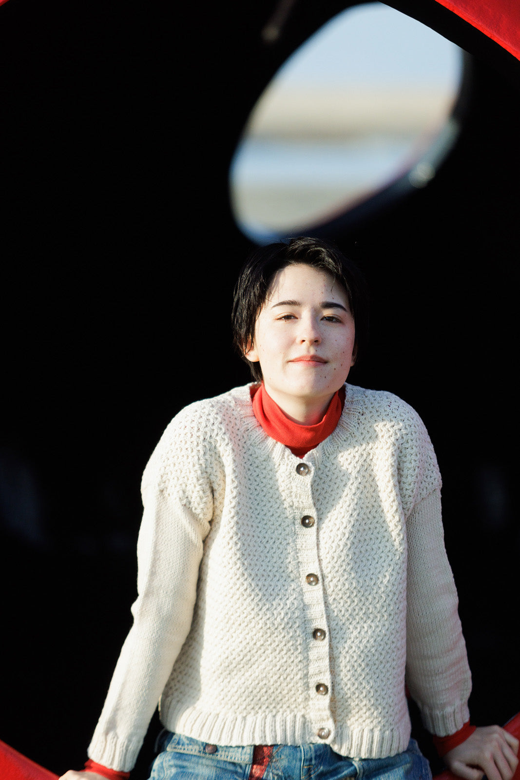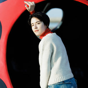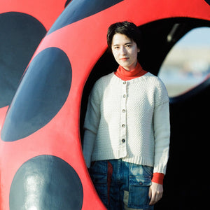 Sazanamiは、身頃のぽこぽこしたテクスチャーが可愛いシンプルな丸襟カーディガン。袖はすっとしたメリヤス編みでコントラストがきいています。
