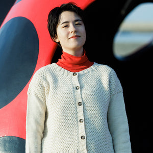 前後身頃それぞれ肩からトップダウンで編みます。襟ぐりの増目をしながら前身頃をそれぞれ編んだら、脇下からは前後身頃を合体し、一緒に往復編みする。身頃から目を拾い袖を編みます。最後に襟ぐりと前立ての処理をします。
