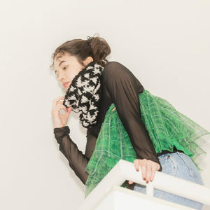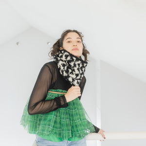 ループヤーンLOOPで編みます。芯糸までウールなので柔らかい肌触り。アルパカ混で暖かいです。シンプルな幾何学模様もクルクルの糸で編むと印象的なテクスチャーになります。ざくざくと編めるのでプレゼントにもおすすめです。