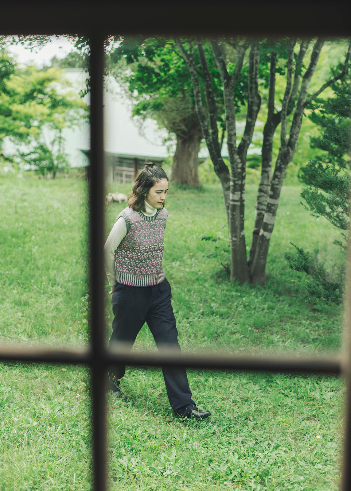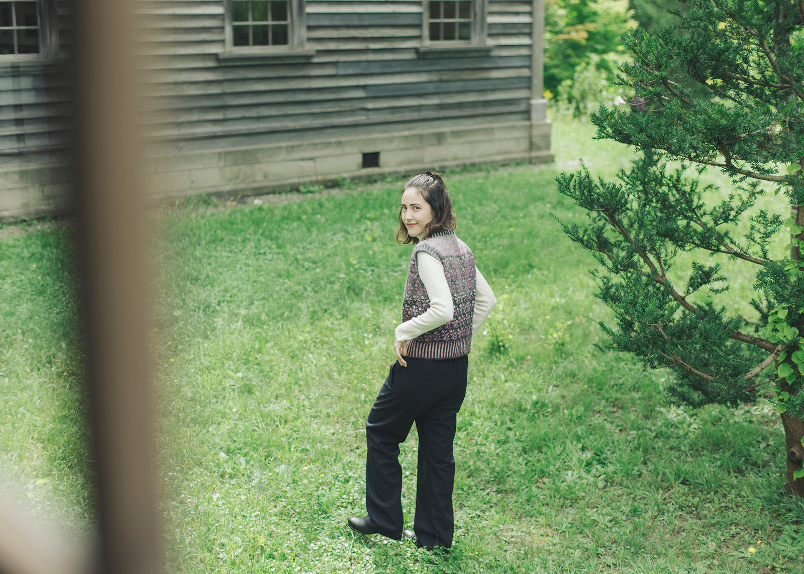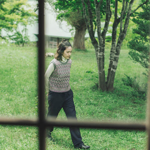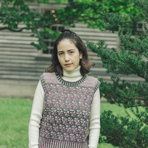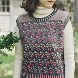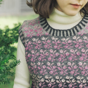 かわいらしい木の実の模様のベスト。身頃は少しゆったりで、裾のリブを長めにしました。地色のグレーと配色のピンクは、ともに3色ずつでフェードを作っています。同じ模様を編んでいきますが、色が変わる位置を様々にずらすことで、美しいニュアンスが出ました。