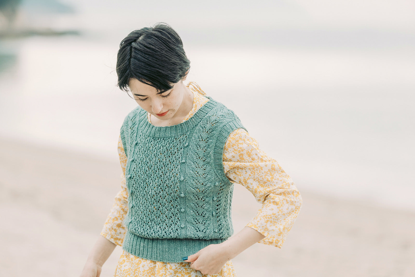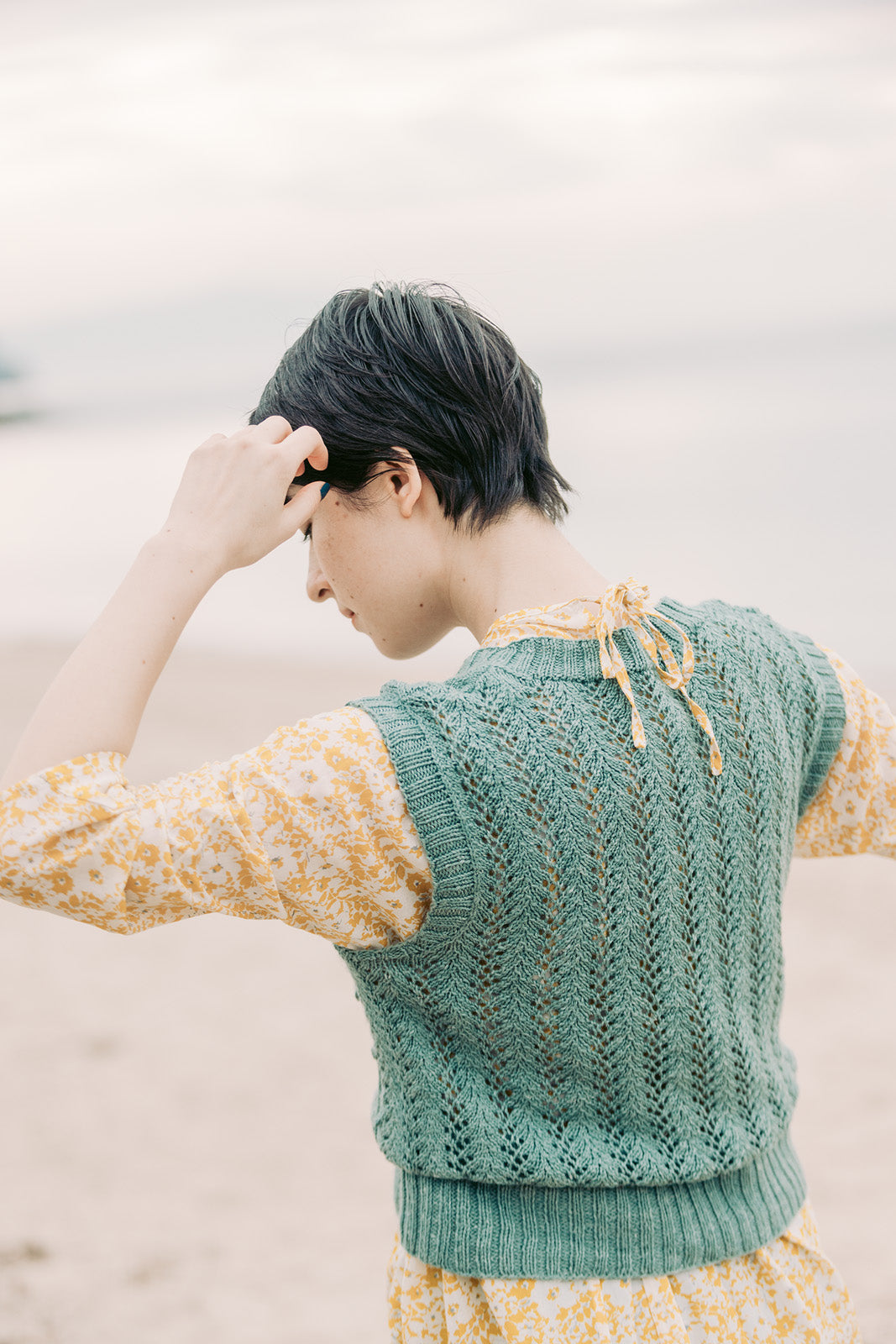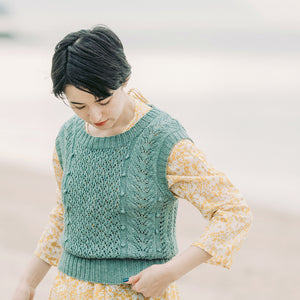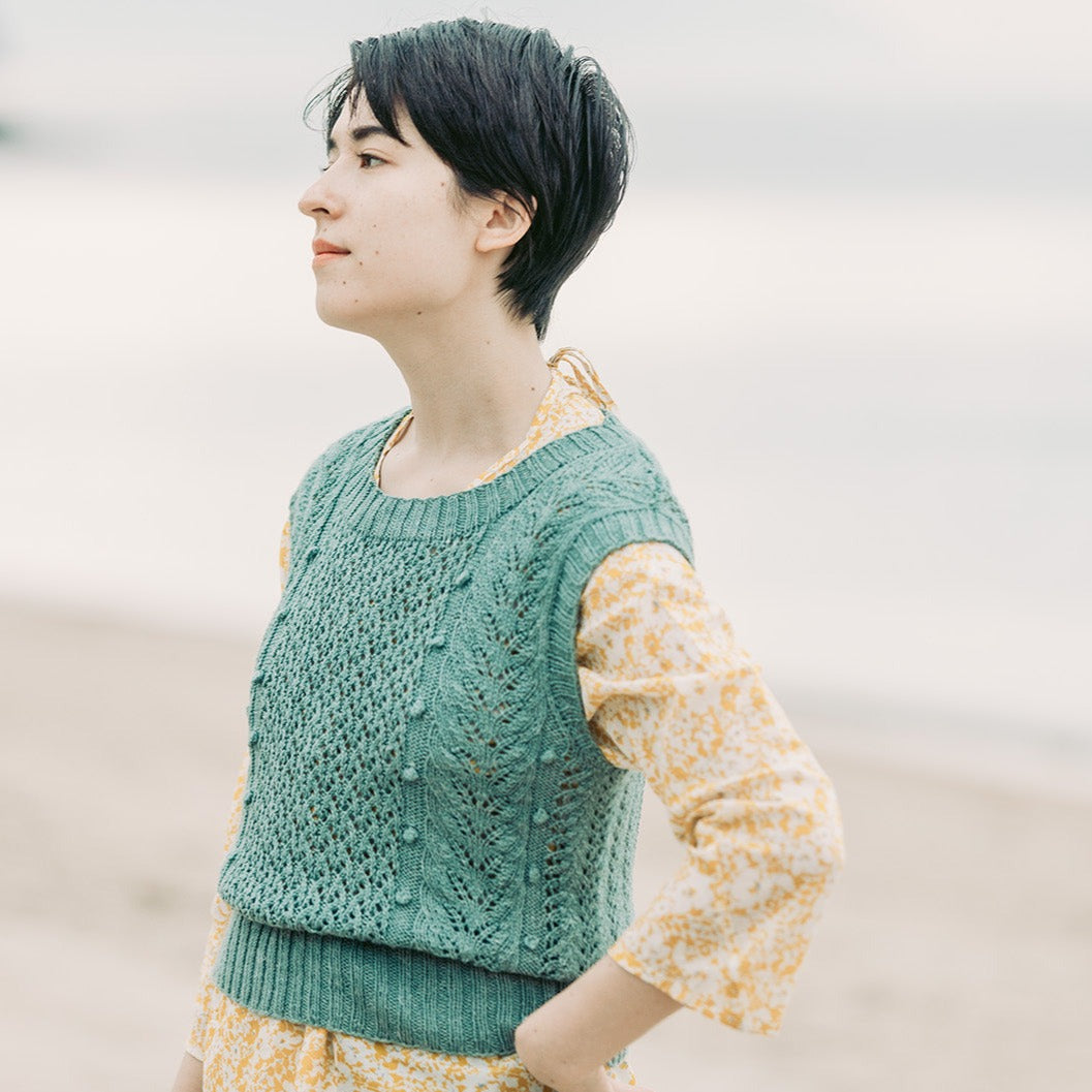 Fingering WeightのParadeで編むレース模様は、少し入ったシルクの艶感で、一層繊細でロマンチックな印象です。ブラウスやワンピースに重ねるだけで着こなしがきまります。柔らかくてちょっとクタッと着れる感じが可愛い。夏のブラウスやワンピースに重ねて。