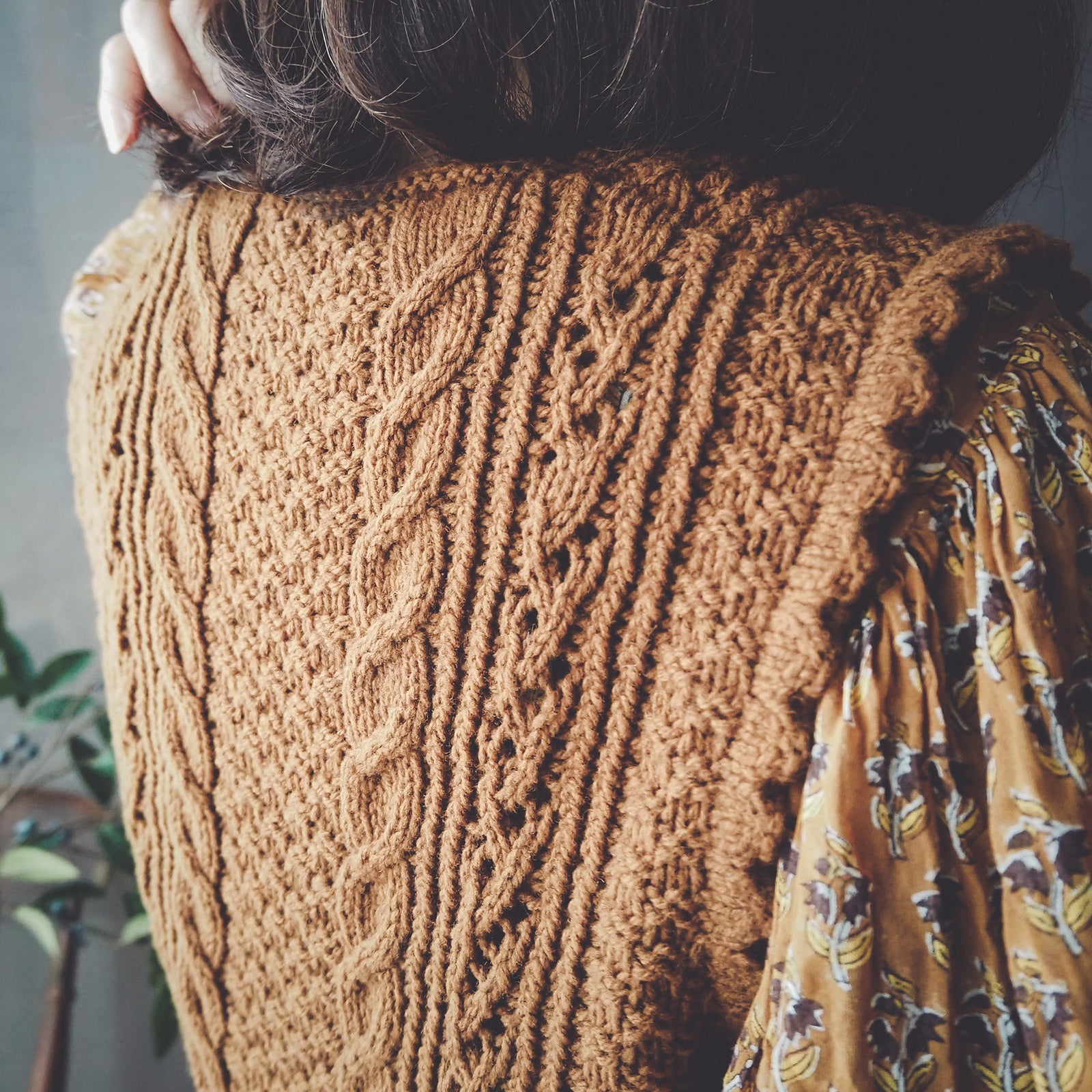 シンプルな形に地模様と交差模様がびっしり入って、編むのも楽しい。弾力のあるDe Rerum Natura Gilliattで編むので模様編みがふっくらと浮き上がり、ほどよい厚みでが出てロングシーズン着られます。