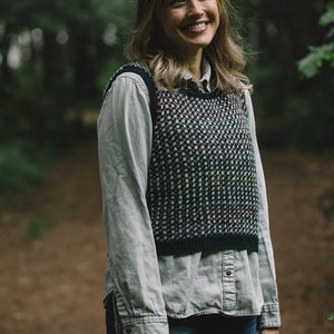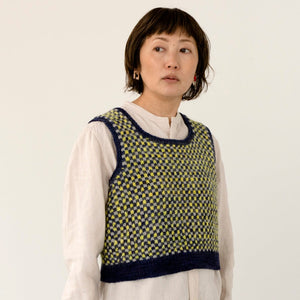 Andrea Mowryのデザイン。みんなの「ベストが欲しい!」というリクエストに応えてデザインしたとのこと。ラウンドネックのシンプルな形で、丈も短めで、いろんな重ね着が楽しめそうです。