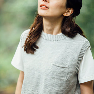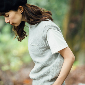 シンプルな形とコンパクトな袖ぐりがマニッシュです。amirisu Hikeで編むので、メリヤス編みも裏編み模様で作る模様部分もばっちり揃って気持ちが良いです。ほどよく厚みが出て身体のラインを拾いすぎずフラットに着られます。シンプルなので男性にもおすすめです。小さなポケットだけがユニークなアクセントに。