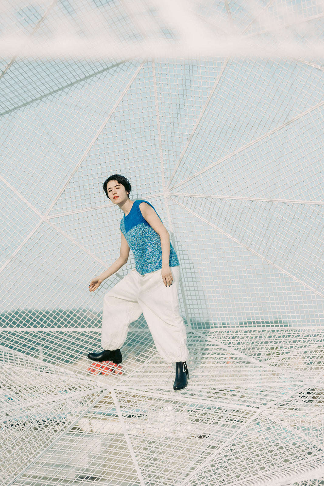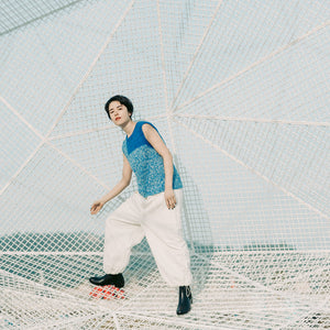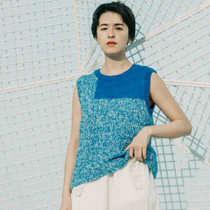 身頃のメイン部分はMCとCCの2本どりで、インターシャで編む肩のパネルはMCの2本どりで編んでいます。光の芸術家として知られるジェームズ・タレルの作品からインスピレーションを得たそうです。タレルの作品のいくつかは直島の地中博物館にあるので、完成させたViewを着て鑑賞にいきたいものです。