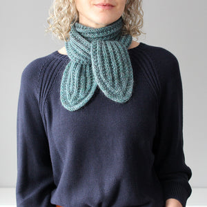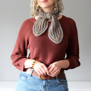 ほっこりした編み地が可愛い。変わりゴム編みの一種で編むので、伸縮性があり、しかもリバーシブルで使えるので、裏を気にせずに巻くことができます。一重に巻くとボウタイのように華やか。寒い時は二重に巻いて首を暖めてくださいね。
