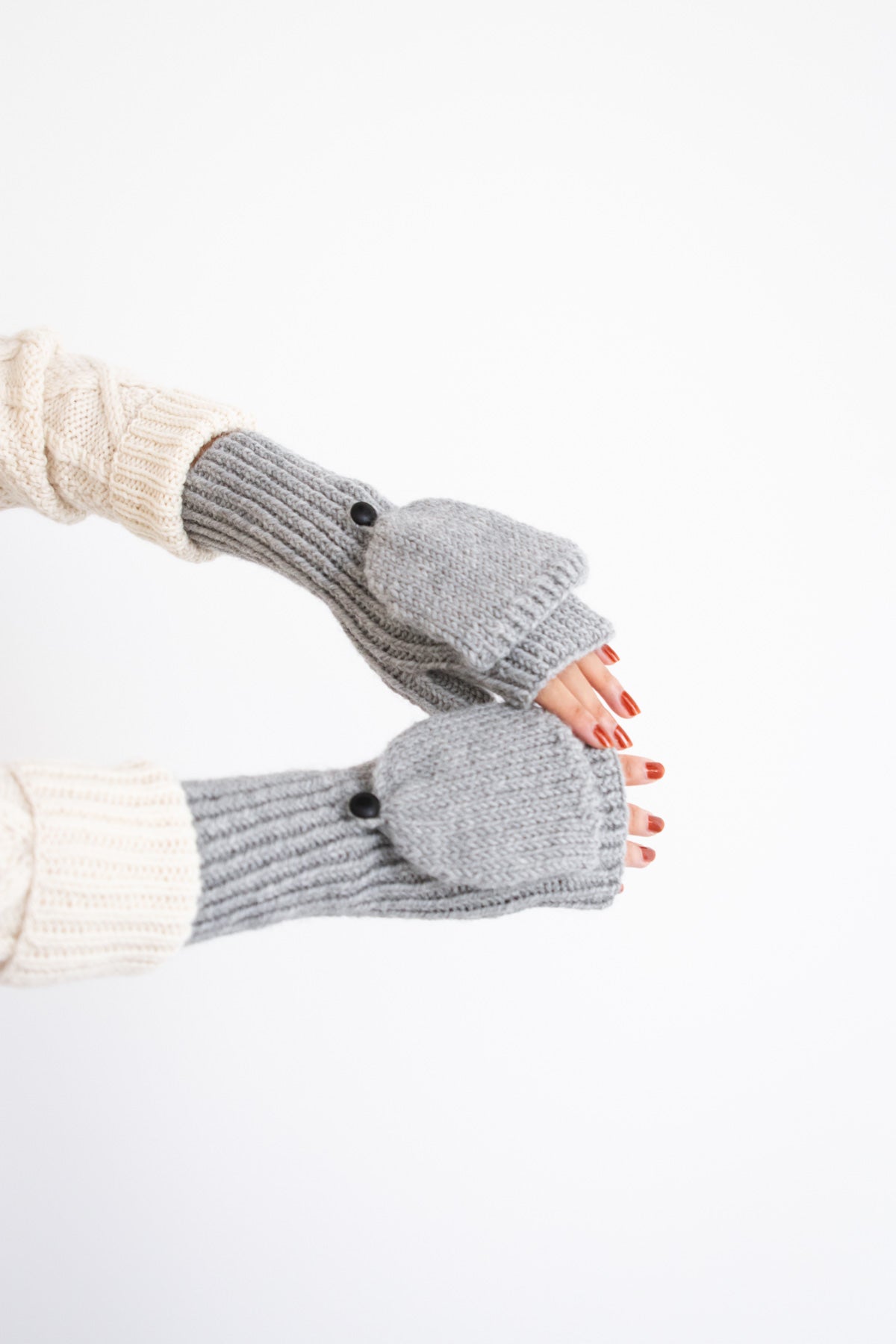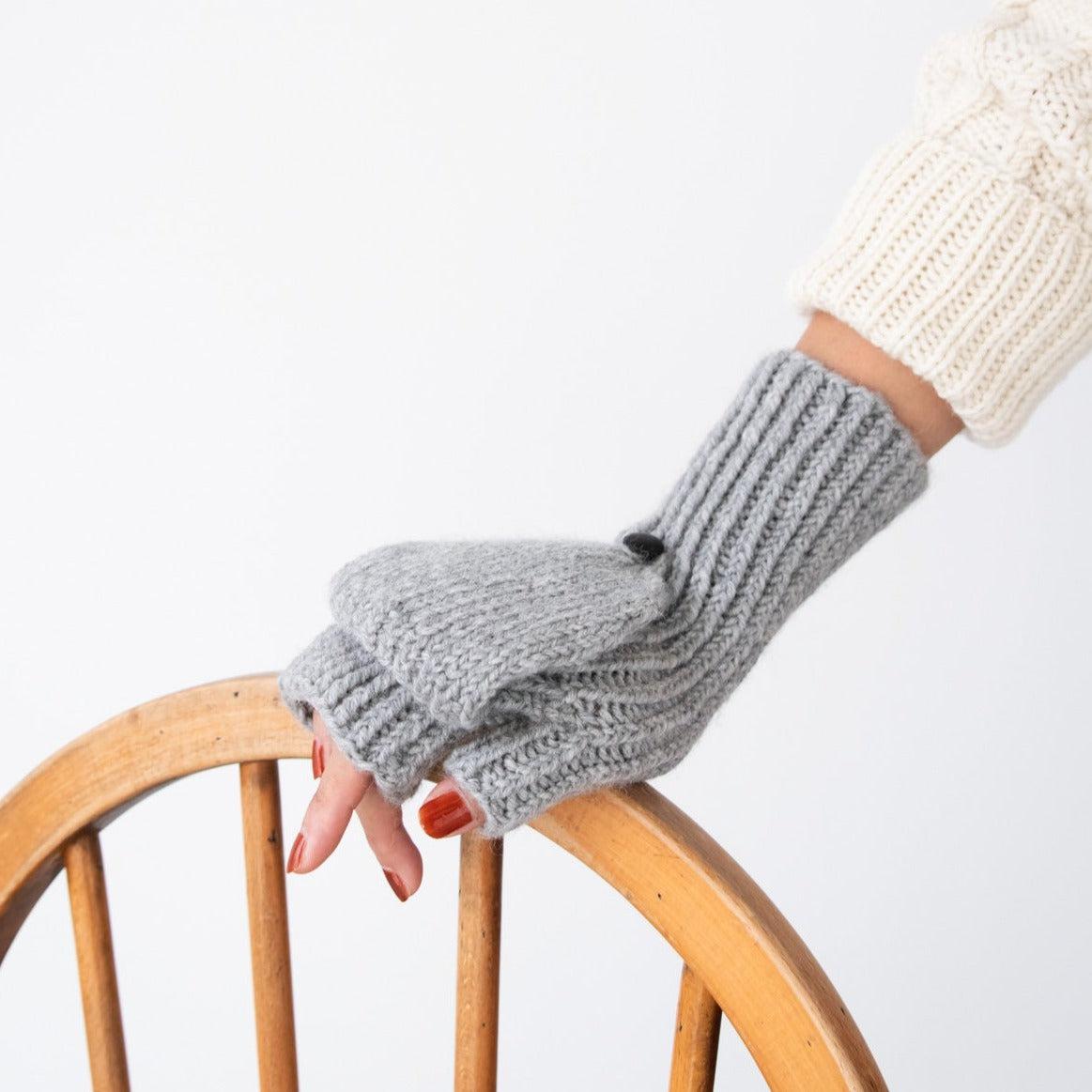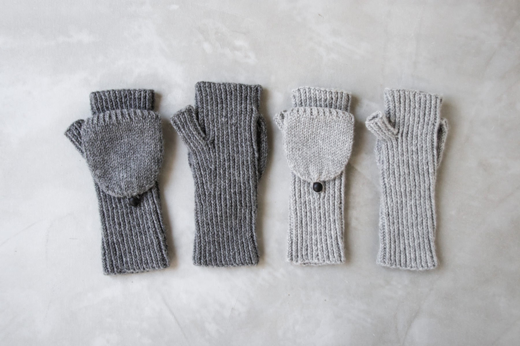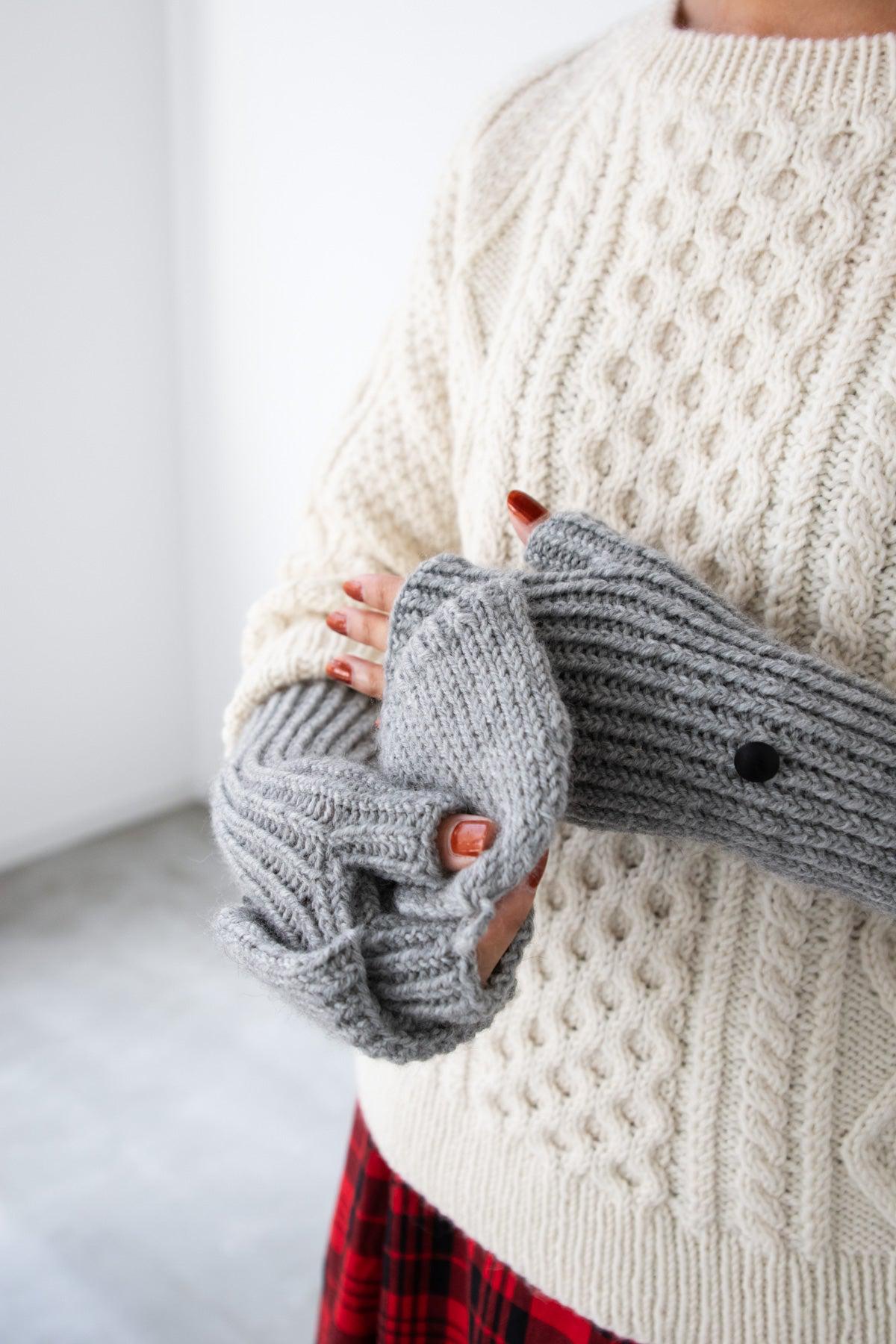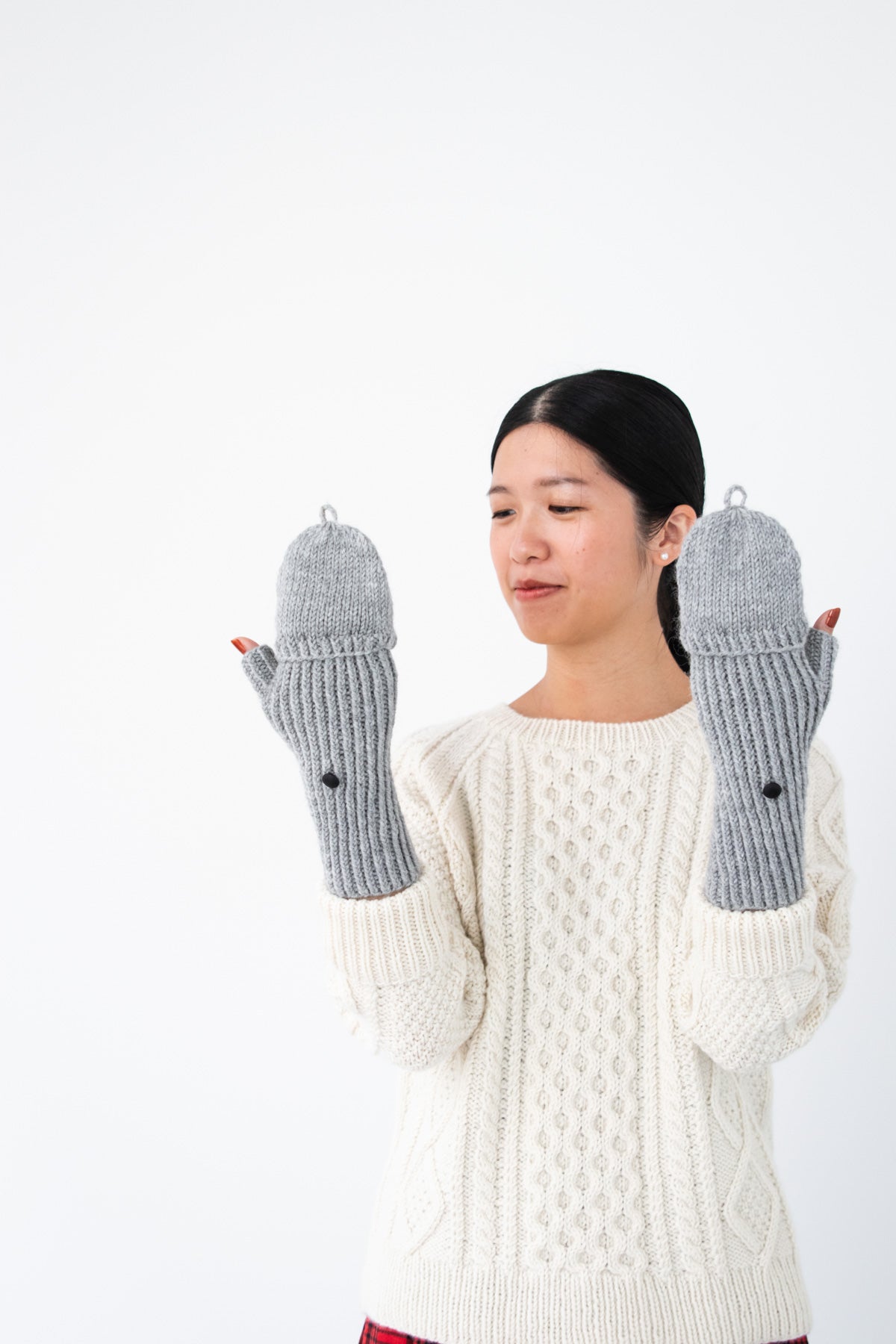 ミトンははめたいけどスマホはいじりたいという希望をかなえてくれる、カバーつきのグローブです。ねじり目模様が浮き上がるしっかりとしたリブ柄は、シンプルで年代や場面を選ばないデザインです。伸縮性があり、指先から手首までを包み込むように温めてくれます。