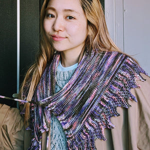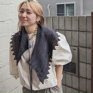Miki Teragaki さんデザインです。大振りのつけ襟なので肩に載せたりぐるっと巻いたりいろんな使い方ができます。1かせで編めるのが嬉しい。アクセサリーのように差し色的に使えるショールなので、ここは今まで気になっていた色を選んで編んでみてくださいね。