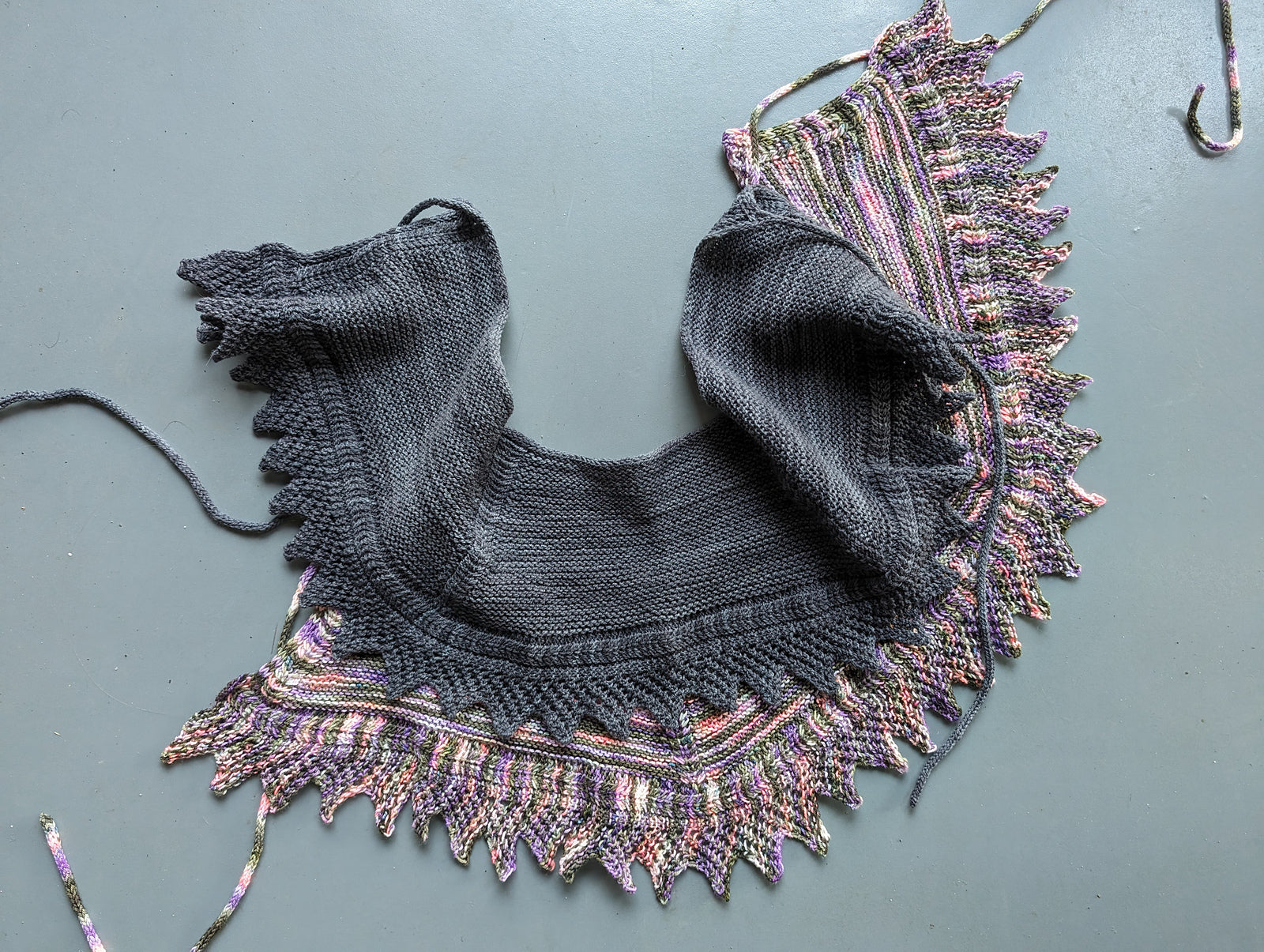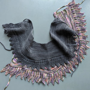 裾の模様編みを先に編みます。レース部分が完成したら横から目を拾いボトムアップで減目しながら襟元に向かって編んでいきます。本体を編み終えたら目を休め、I-cordを作り本体と編み付けて本体の襟部分をI-cord Bind-offをし、再びI-cordを編みます。