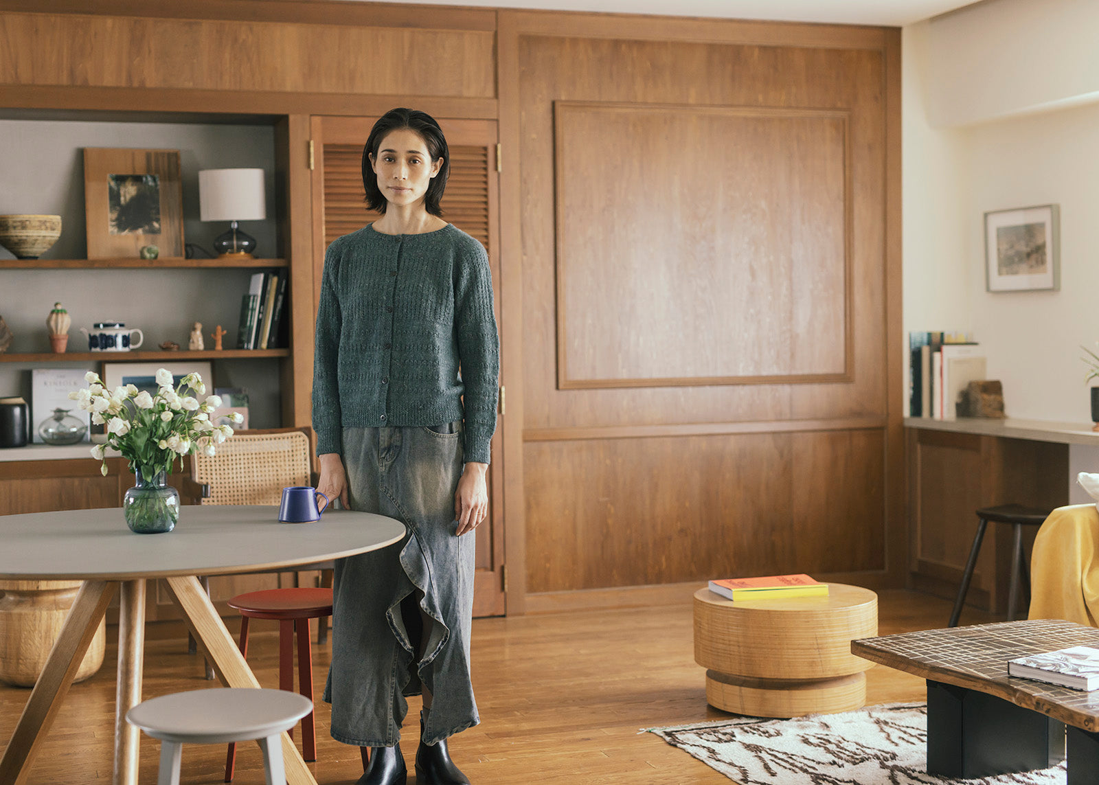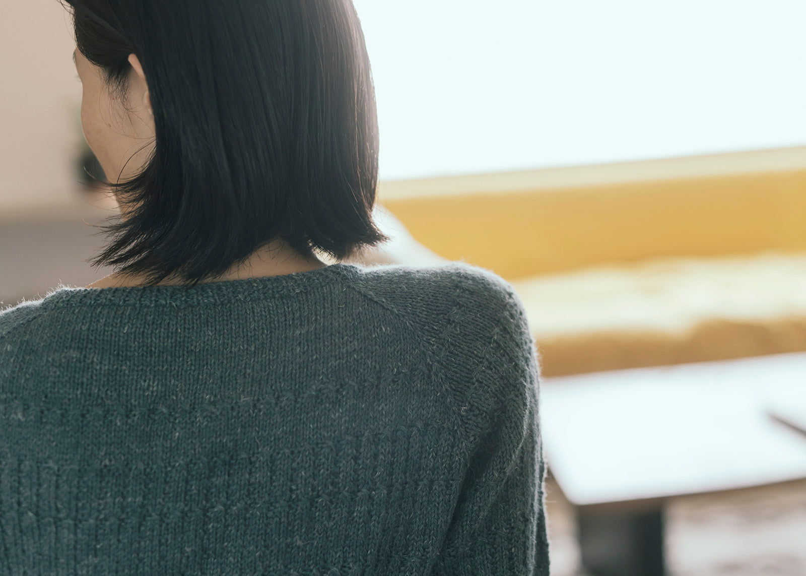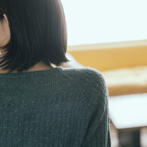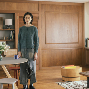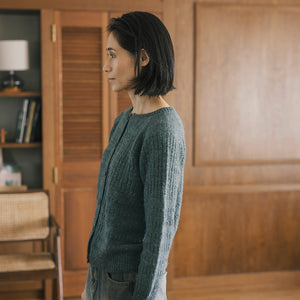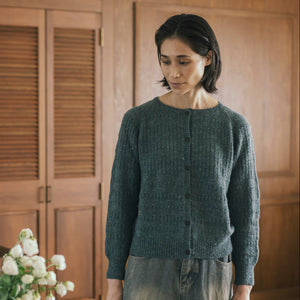 ほんのりと浮かび上がる、控えめなストライプのテクスチャがかわいらしいラグランスリーブのカーディガン。頭の中に浮かぶ様々なイメージを編み地に起こしていく中で偶然生まれたという、シンプルながら美しいステッチで構成されており、さらに2種類の糸を引き揃えているので奥行きも感じられます。ふだんの装いに合わせて、お好きな長さに仕上げてくださいね。