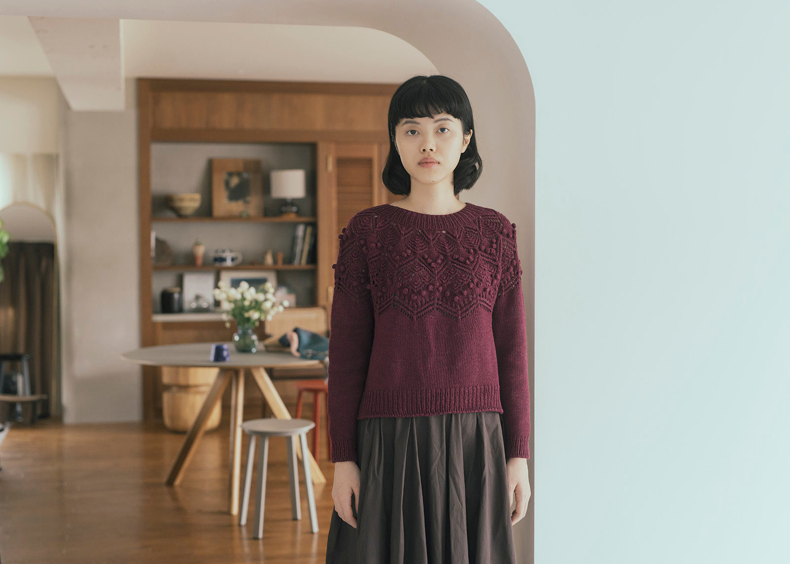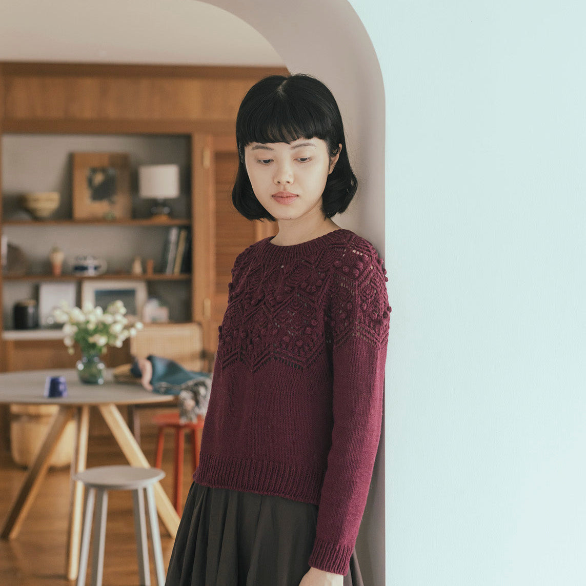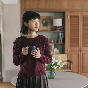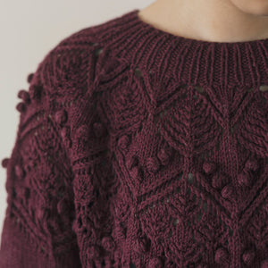 DKで編むボッブルが可愛い丸ヨークセーター。Olerkiはバスク語で詩の意味。大きめのボッブルとレース編みが、詩を詠むようにくるくると流れ良く配置されています。裾のリブに入っているスリットを活かして、色々なボトムスとコーディネートを楽しんで。