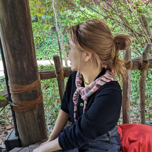 いつもおしゃれなパターンと着画で私たちをワクワクさせてくれる Miki Teragakiさんデザインのシンプルスカーフです。端にリボンのついた三角スカーフで、首に巻いたり頭にかむったり肩に載せたり、1枚あればいろんな使い方ができます。