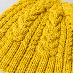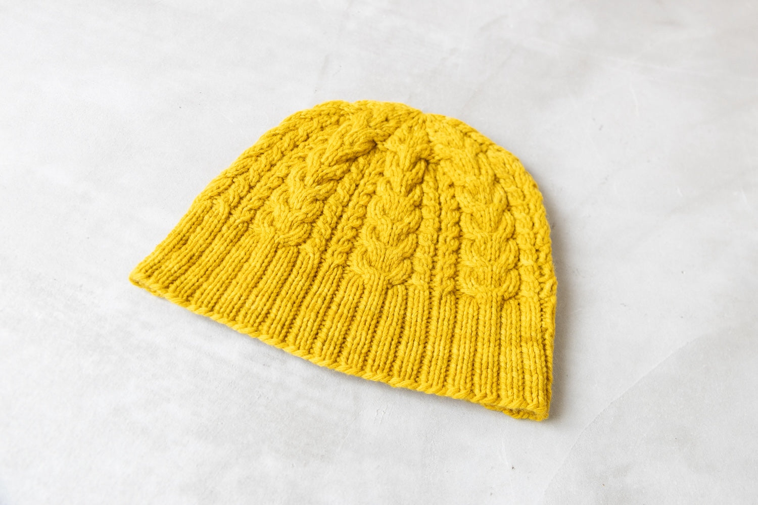 ブリムからボトムアップで編みます。輪で編み、ブリムをリブ編みして、その後模様編みを編みながら本体を編み、減らし目をしながら形を作ります。