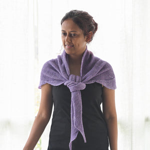 縁のナミナミが可愛い。 Ysoldaが カリフォルニア州のマリン市民会館に訪れた際にインスピレーションを受けたとのこと。基本はガーター編みで、巧みに考えられたケーブル編みとすべり目の縁でこの美しい曲線を作っています。完全シンメトリーの形で、裏表はほとんど見分けがつかないほどなので、いろんな巻き方が楽しめます。