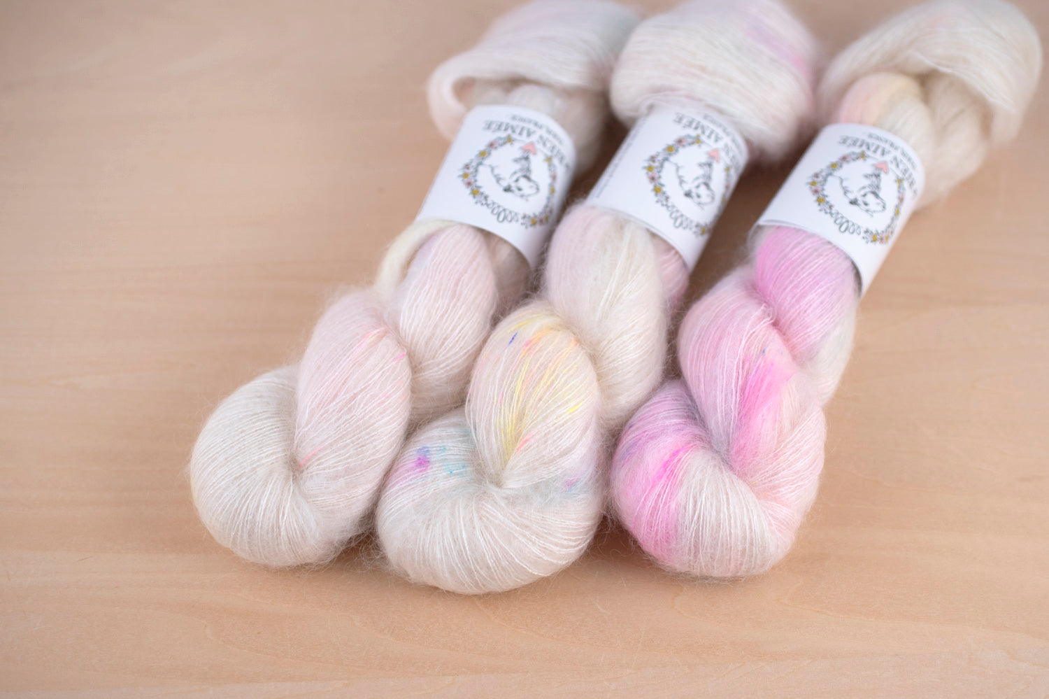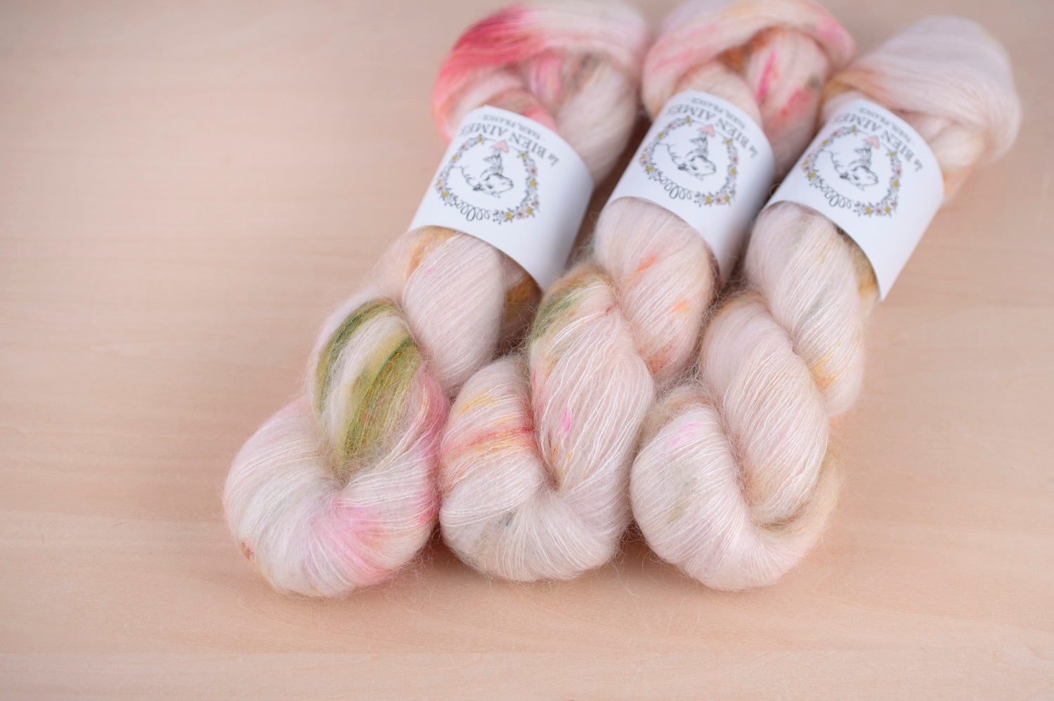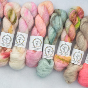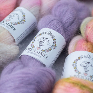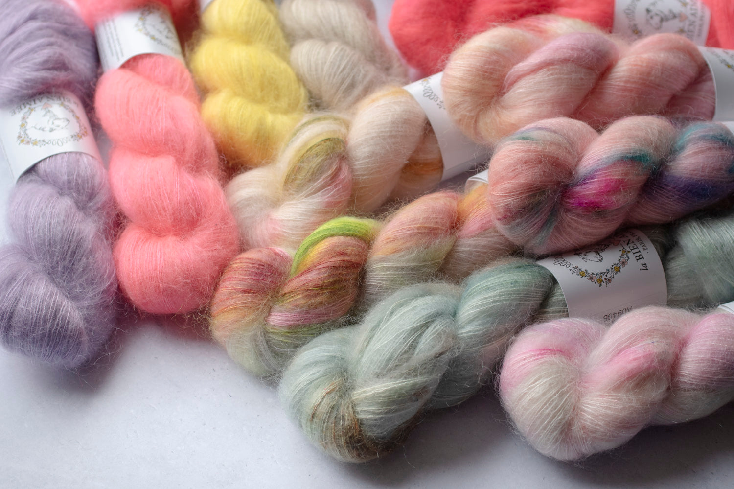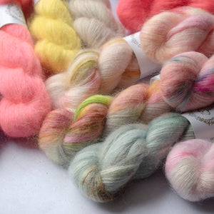 マットでしっかりとしたシルクの芯が、きめ細やかなキッドモヘアに包まれており、繊細ながらも豊かな毛羽立ちを生み出します。