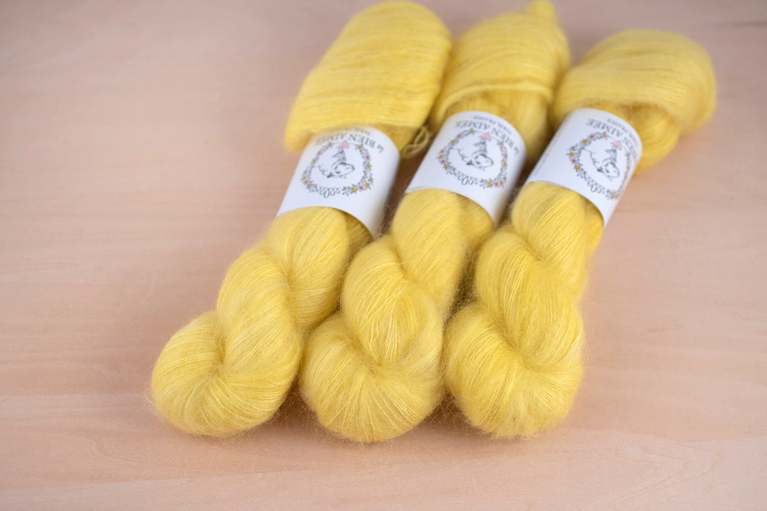 Soyeuxはフランス語で「絹のような」という意味。64%キッドモヘア、36%シルクのふんわりとした質感が特長のレースウェイトヤーンです。