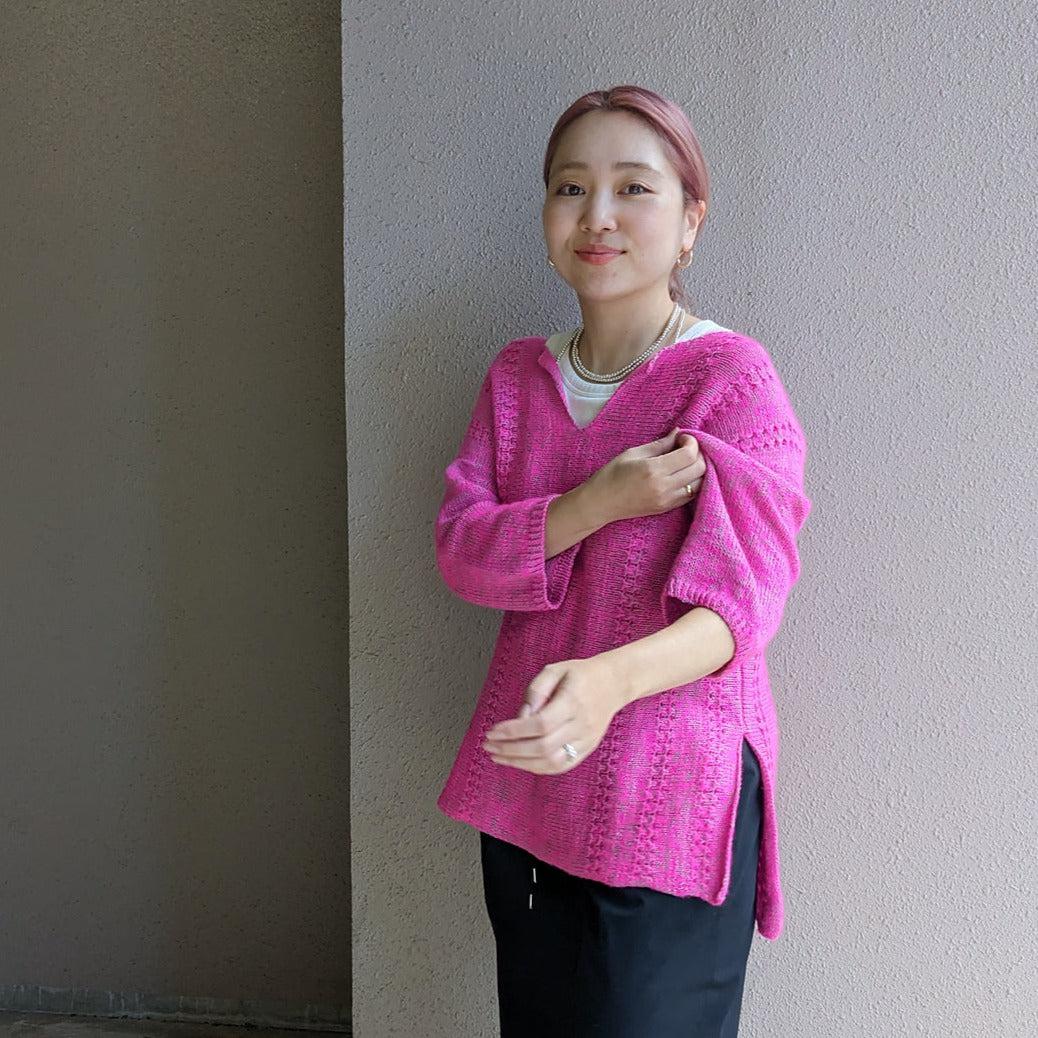 身頃を横から往復編みで編みます。肩にマチを作ることで肩下がりを作ります。前後身頃を分けて編み、前身頃の中心には切り込みが入ります。ネック部分が終わったら再度前後身頃を合わせて編み、マチ部分を減目し、身頃を編み終えます。脇下は後からお好みの長さをとじ、その後袖を拾い目し、袖口に向かって編みます。