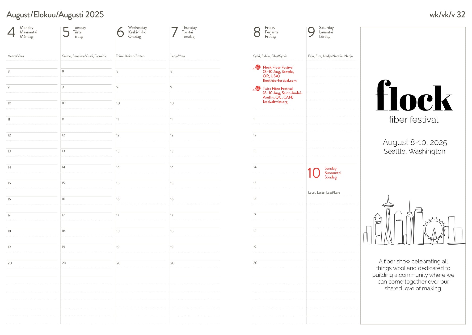お洒落な編みもの出版社のLaine Publishingが作るスケジュール帳なので、ただのウィークリープランナーだけではなく、メモやプロジェクトのアイデアをスケッチするのに十分なスペースがあります。また、世界各地で開催される100個以上のファイバー&ニッティング・イベントが掲載されていて、全部訪れるのは難しいと思いますが、旅行で実際に足を運んでみたり、想いを膨らませたり、一冊のスケジュール帳によって編みものの世界が広がりそうです。