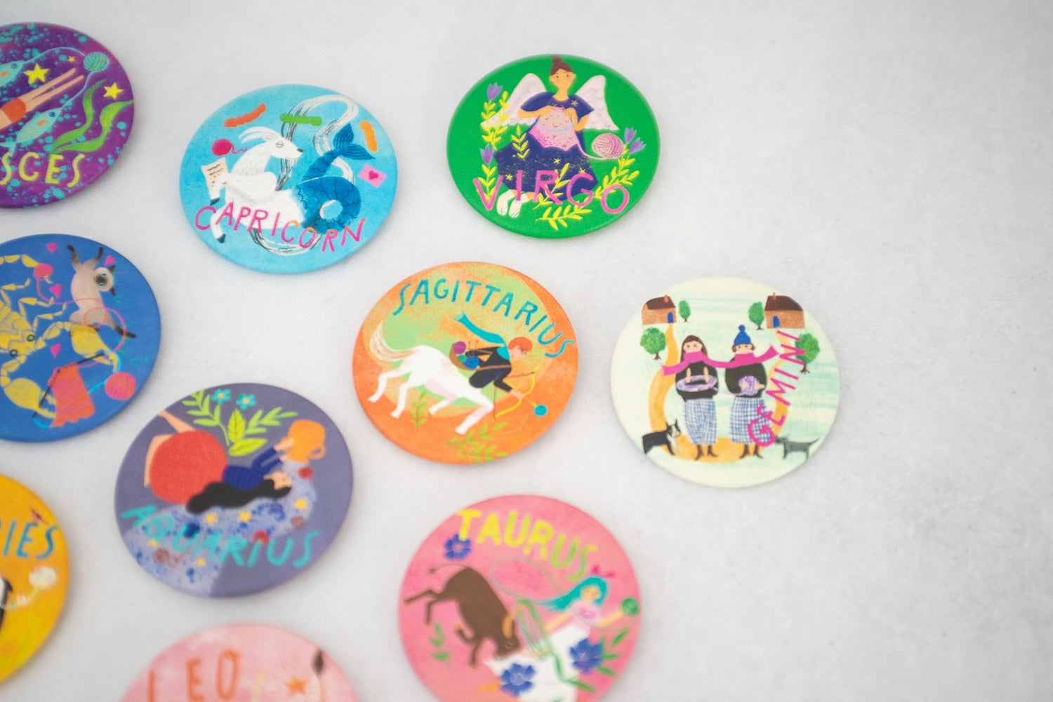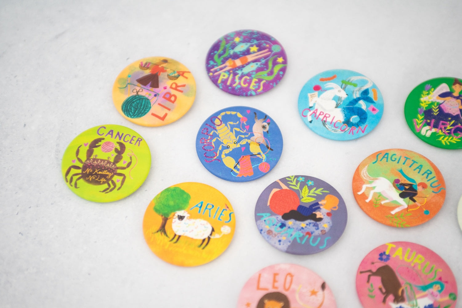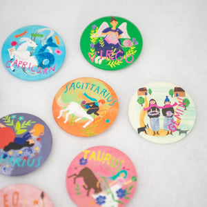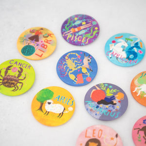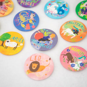 メリが描き下ろしたキュートな星座イラストの缶バッジ。