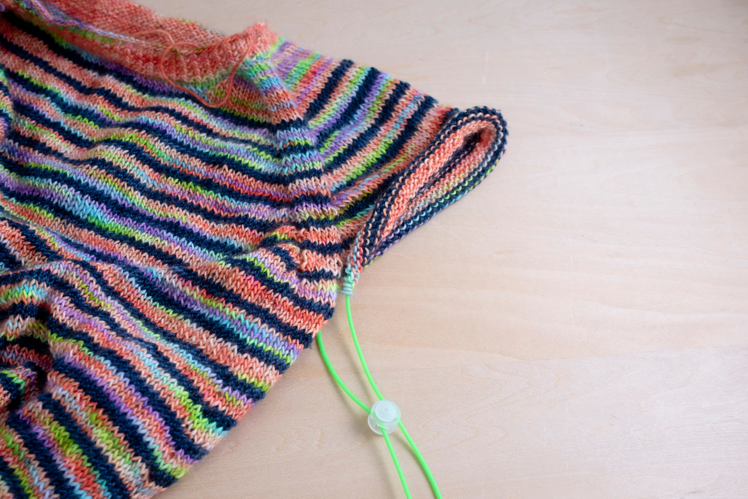 袖など目を休めたい時に、針先をコードにきゅっと差し込んで、編み地をスライドしたら簡単にコードに目を移すことができます。