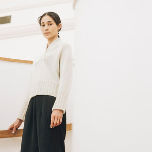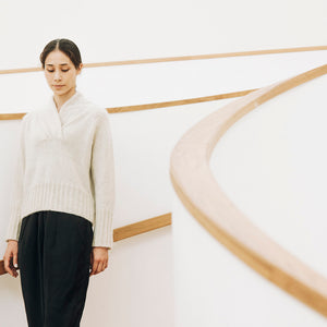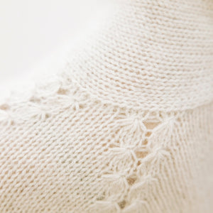 mYak Baby Yak Mediumで編むふわふわの編み地と、たんぽぽの綿毛が並んだようなヨークラインと、長めに編んだ裾と袖口の変わりゴム編みと、どこをとってもエレガントさがあります。
