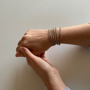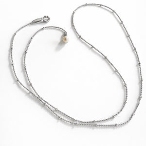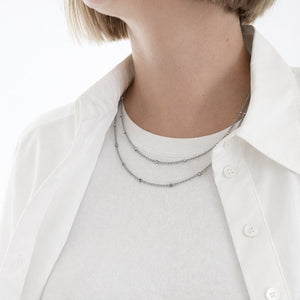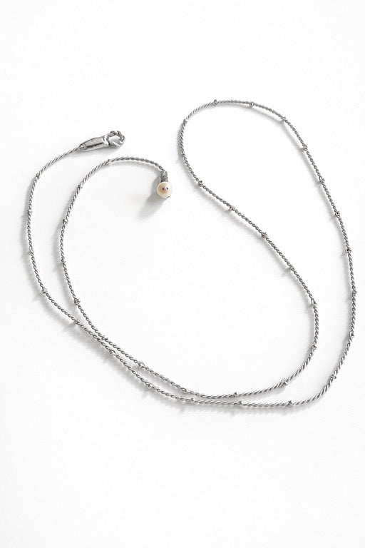 エレガントなネックレス。繊細なシルバーのワイヤーと艶やかなビーズで丁寧に作られています。長さは1.1m で、首に一重または二重に巻いてスタイリングすることができます。くるくる巻いてブレスレットとして使っても素敵。