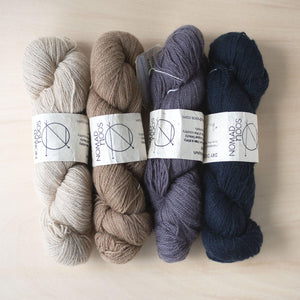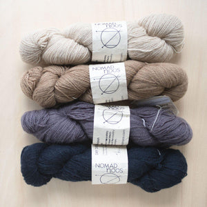 このページの糸は、書籍「Nomad Knits」掲載作品の指定糸と生産のタイミングが異なるため、糸長が短いです。ご購入の際にはご注意ください。
