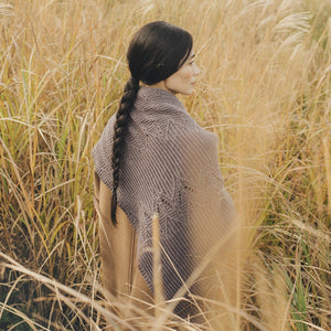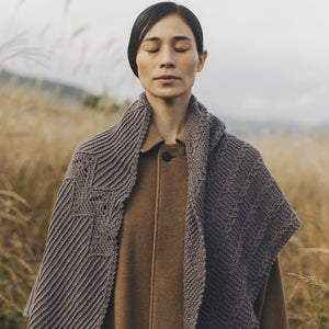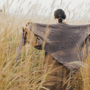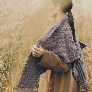 大判のショールの中で、ねじり目のラインが交差したり離れたり戻ってきたり、移り変わりを楽しめます。この模様は、山に積もった雪や流れる小川の上に太陽の影が揺れ動く、午後から夕暮れにかけてのひとときからインスピレーションを得たとのこと。時の移ろいや重なりを感じながら編みたいショールです。