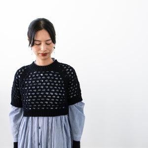 トップダウンでシームレスで編みます。全体を覆いつくす大きなホールは単純なレースパターンの繰り返しで作り、太めの針でザクザク編むのであっという間に編めます。ふかふかのStrollで編むのでレース模様が編みやすくて嬉しい。