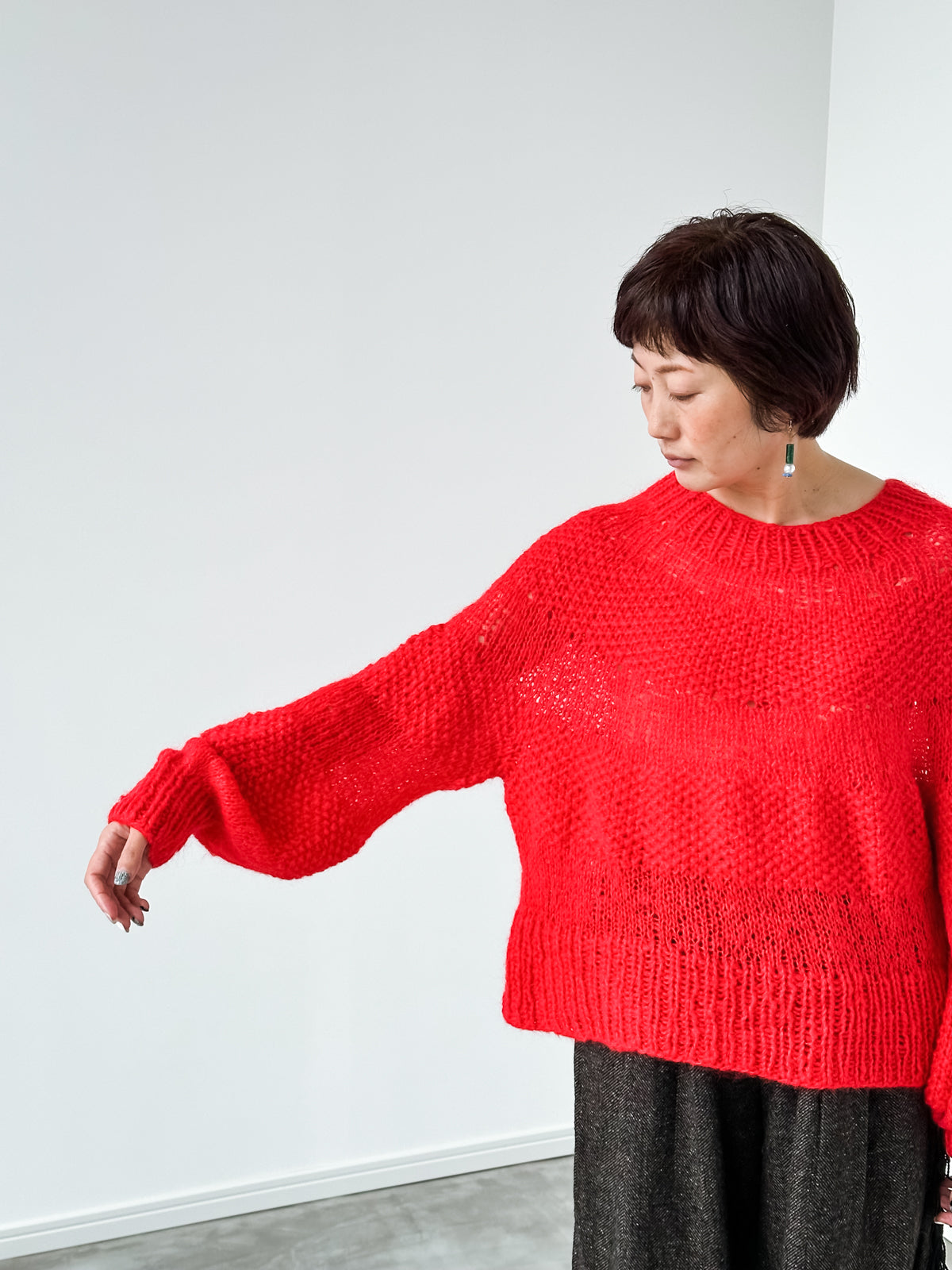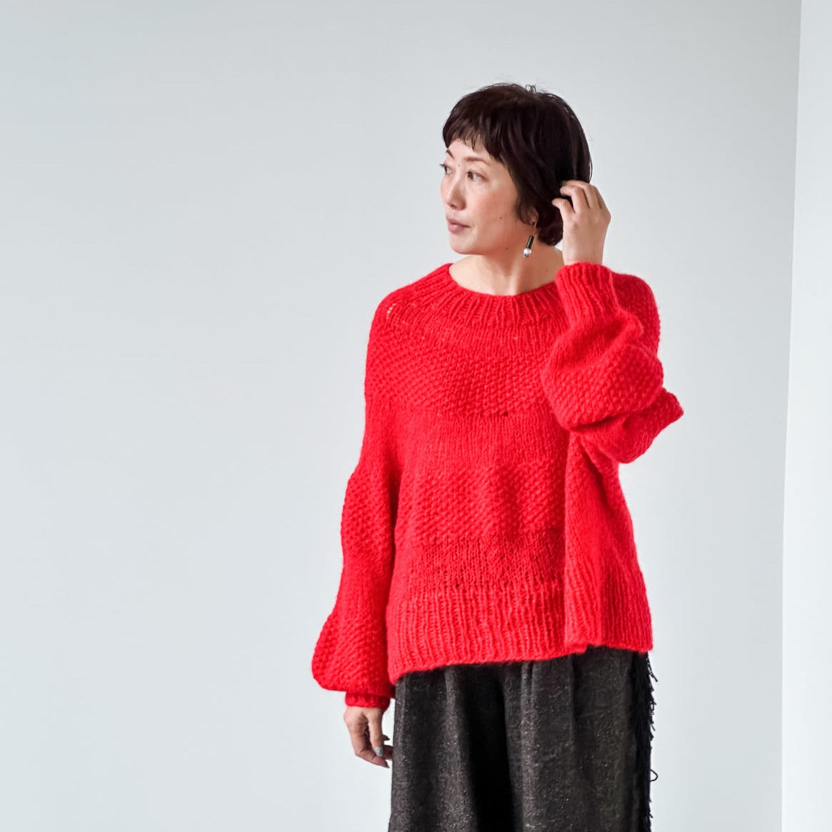 amirisu Flutterのふわふわ感と透け感を存分に楽しめるプルオーバー、Matisse。2本取りの鹿の子模様と1本取りのメリヤス編みの組み合わせで編み、その強弱のあるボーダーが新鮮です。トップダウンで、太い針でざっくり編むので、大らかな気持ちあっという間に編めそうです。