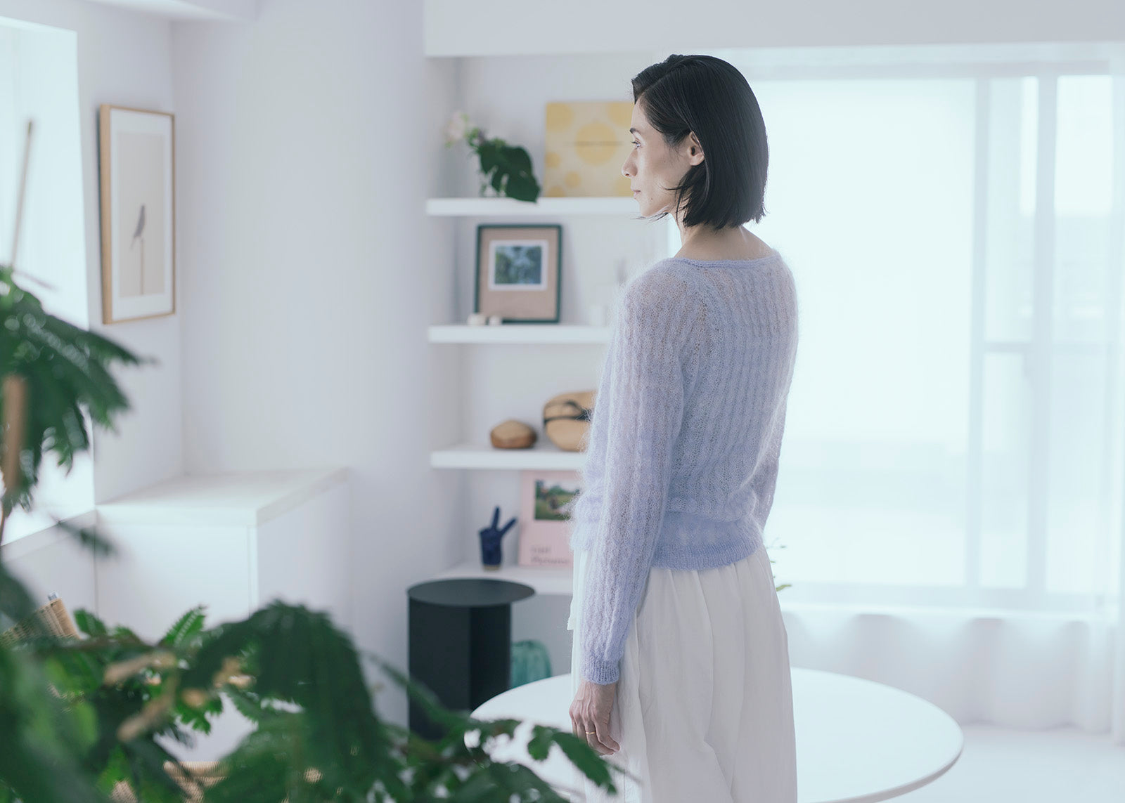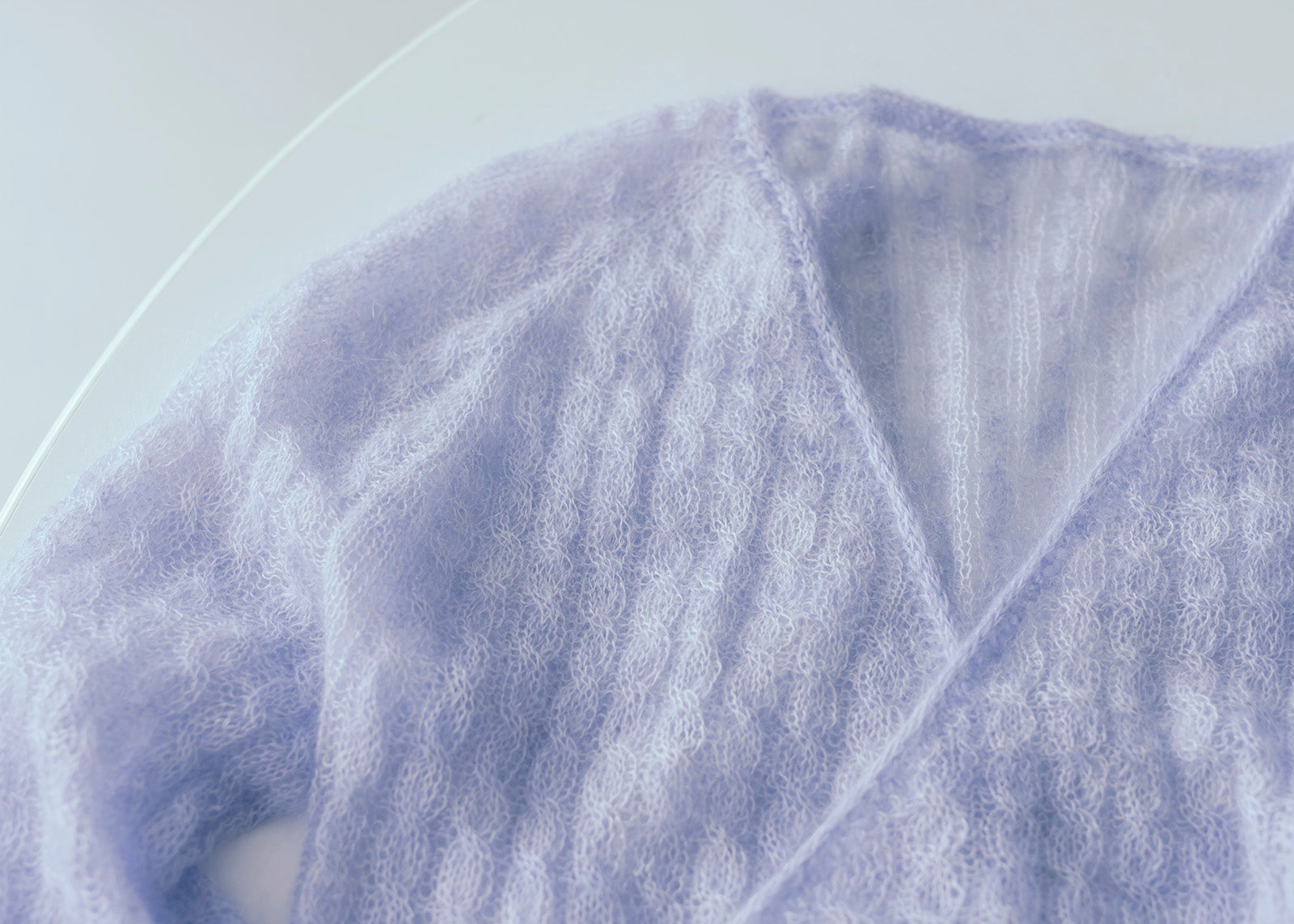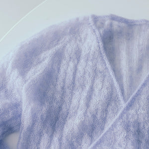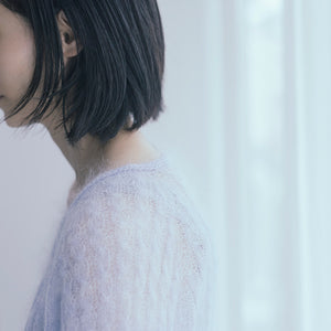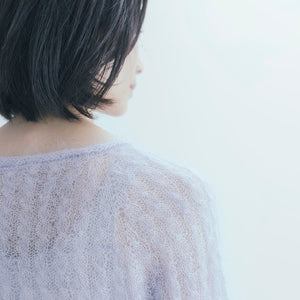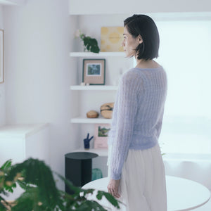 Myosotisはフランス語でワスレナグサのこと。シルクモヘア一本だけで編んだカシュクールのトップスは、可憐なワスレナグサの花びらのように軽やかで、紫がかった毛糸の色も花の色をそのままに反映しています。