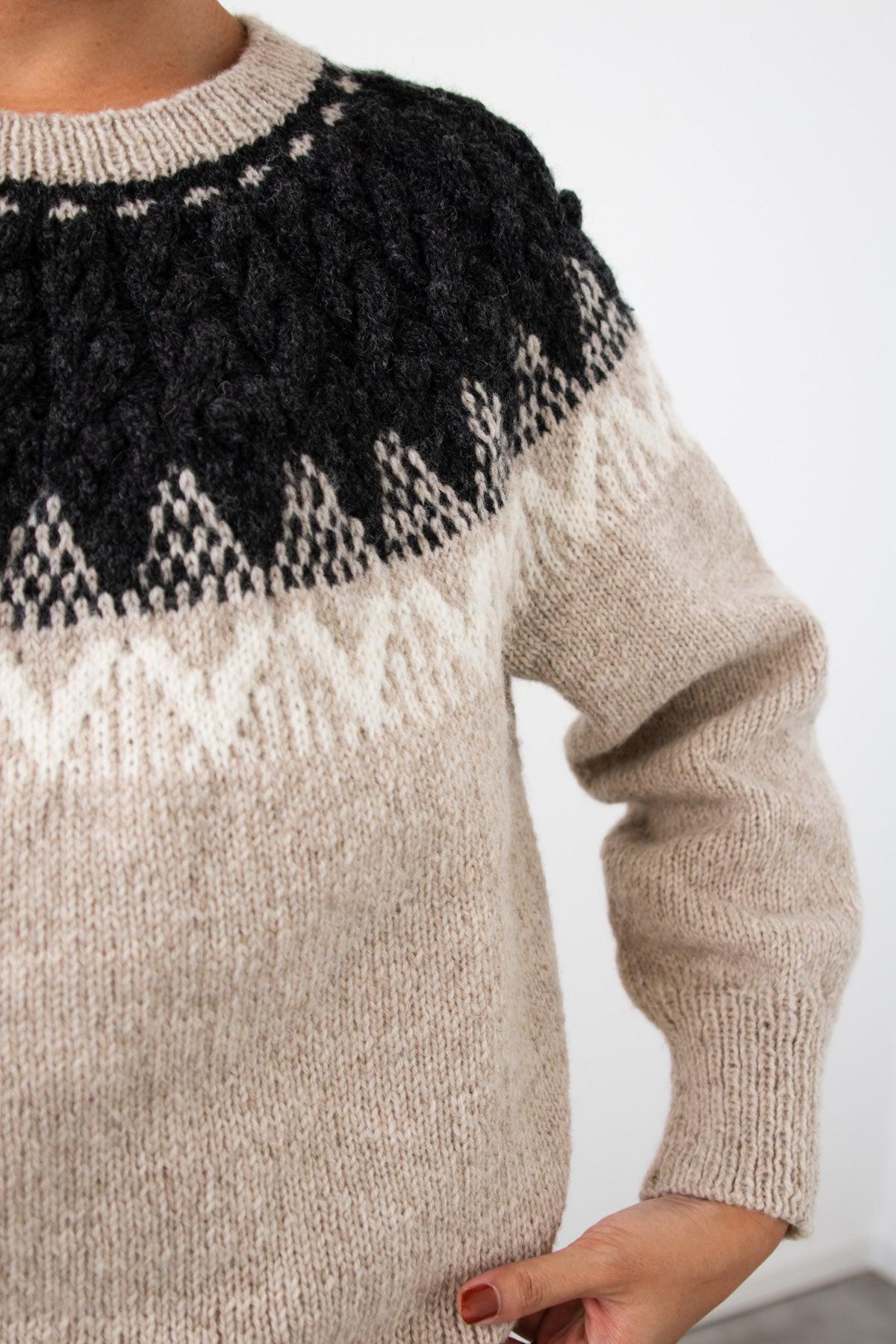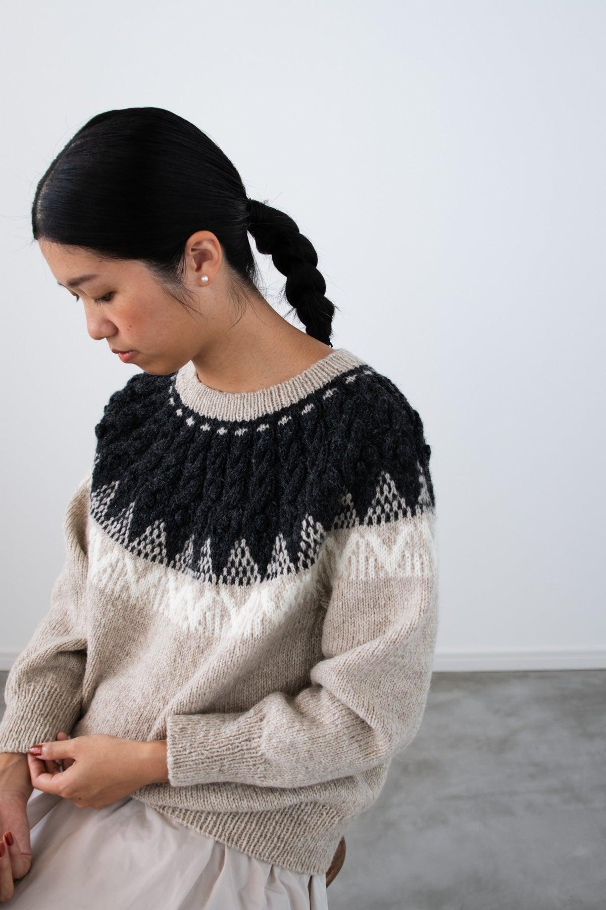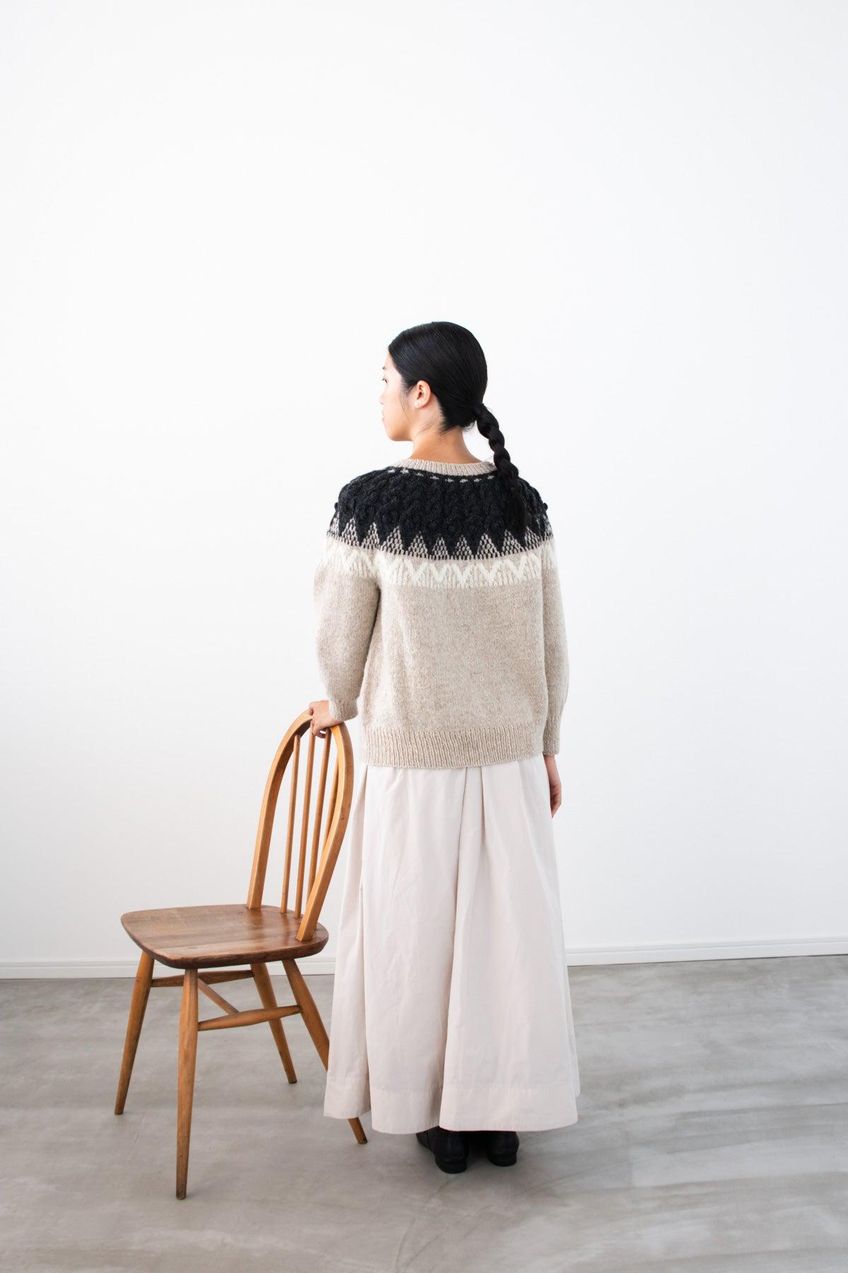三角模様がグラフィカルに並んだヨークセーター。途中に入るケーブル編みが立体的にアクセントになっています。トップダウンで編むので、とじはぎが少なく、袖丈なども調整しやすいのが嬉しい。
