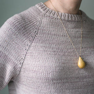 木の塊から雫の形を彫り出して、幾重にも漆を塗り重ねたペンダントトップです。ご縁があってお借りしました。丁寧に作られたものの存在感が、繊細な染めのHikeのセーターにぴったり合っていました。