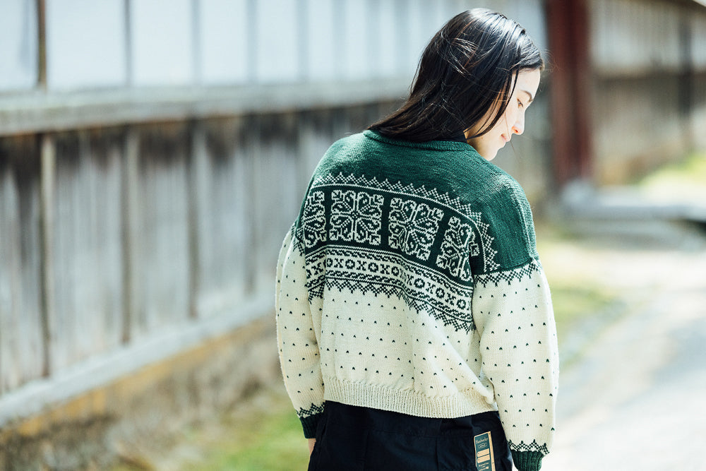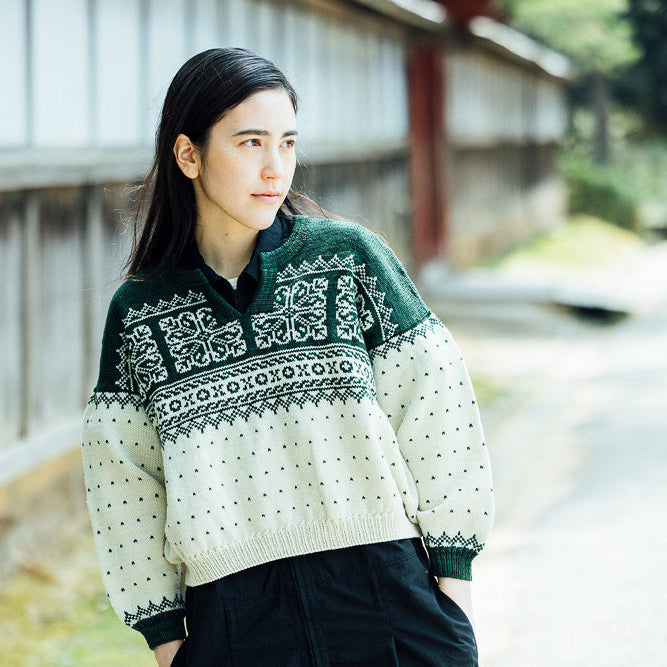ヨーク部分に広がる伝統的な編み込み模様と、すっきりとしたシルエットが魅力の一着。クラシカルな雰囲気と現代的な着やすさを兼ね備えたセーターを、ぜひお楽しみください。