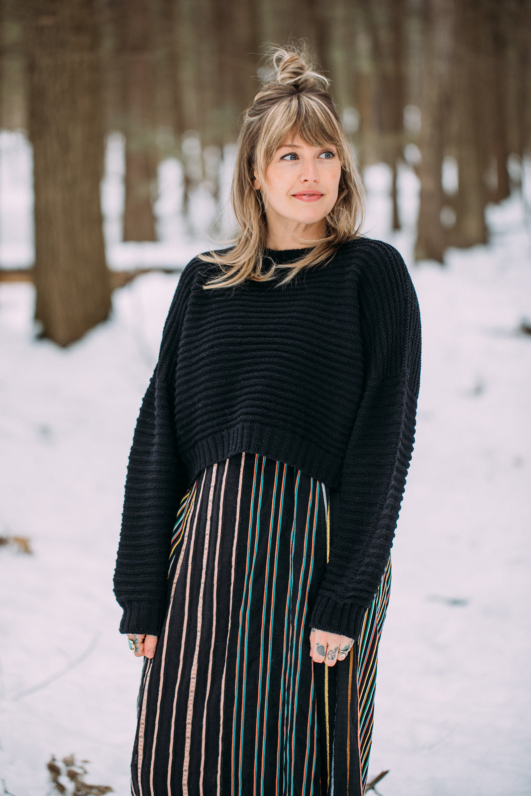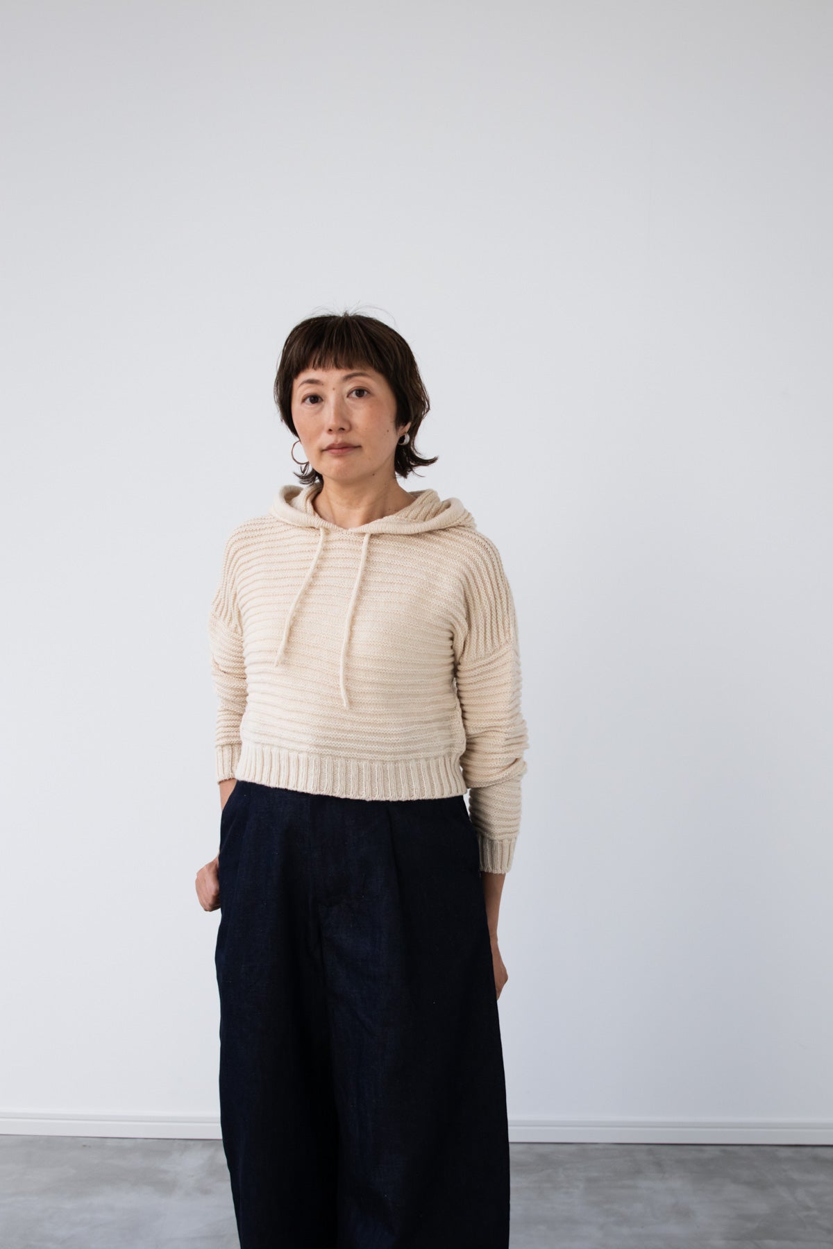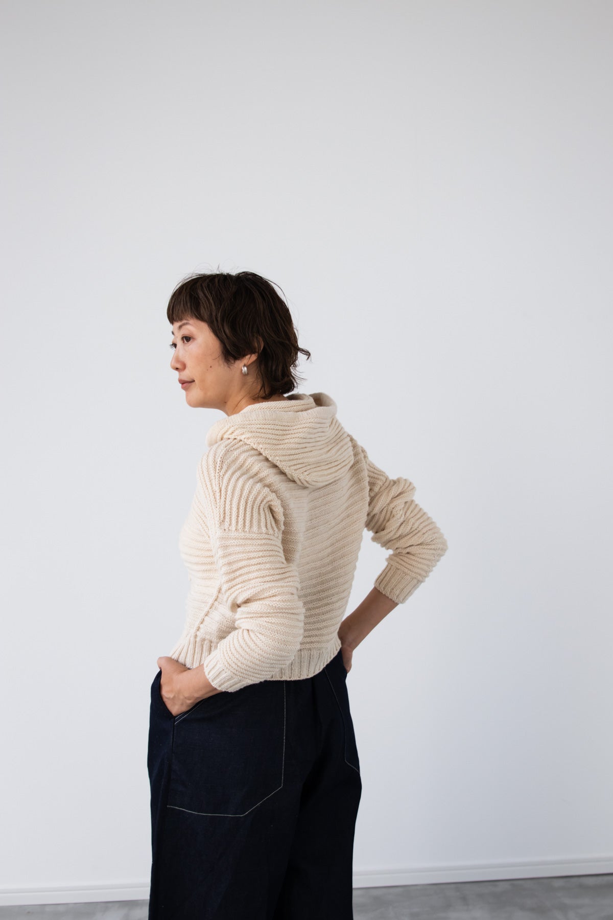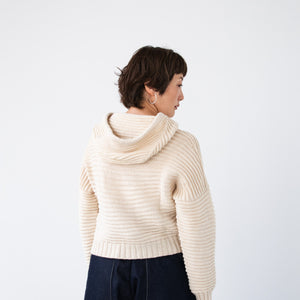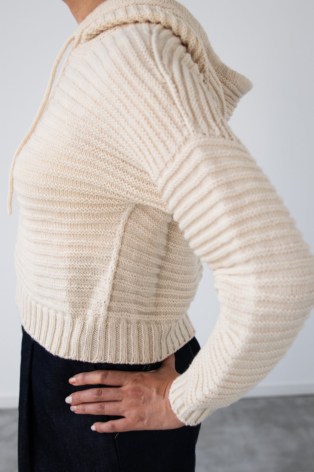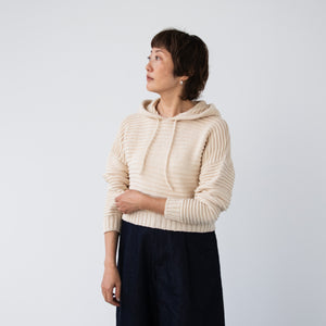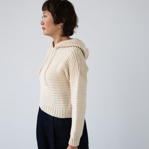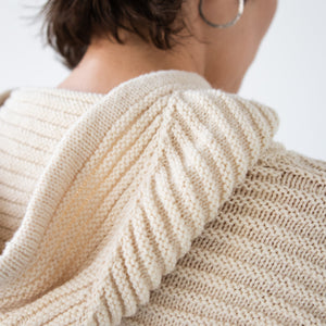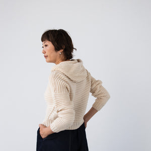 amirisu Sprintで編むので、ポコポコのラインがくっきり出てきれいです。軽いのでフード部分に引っ張られません。こちらのパターンでフード無しも編めますが、ぜひフードの暖かさを体感してくださいね。