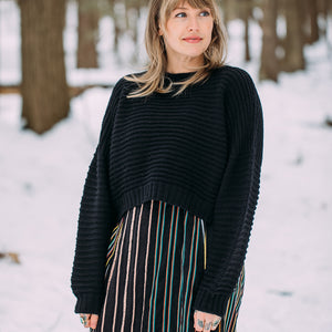 裾から輪で編んでいきます。ヨーク部分で前後身頃に目を分け編んでいきます。引き返し編みで肩のシェイピングを作ります。