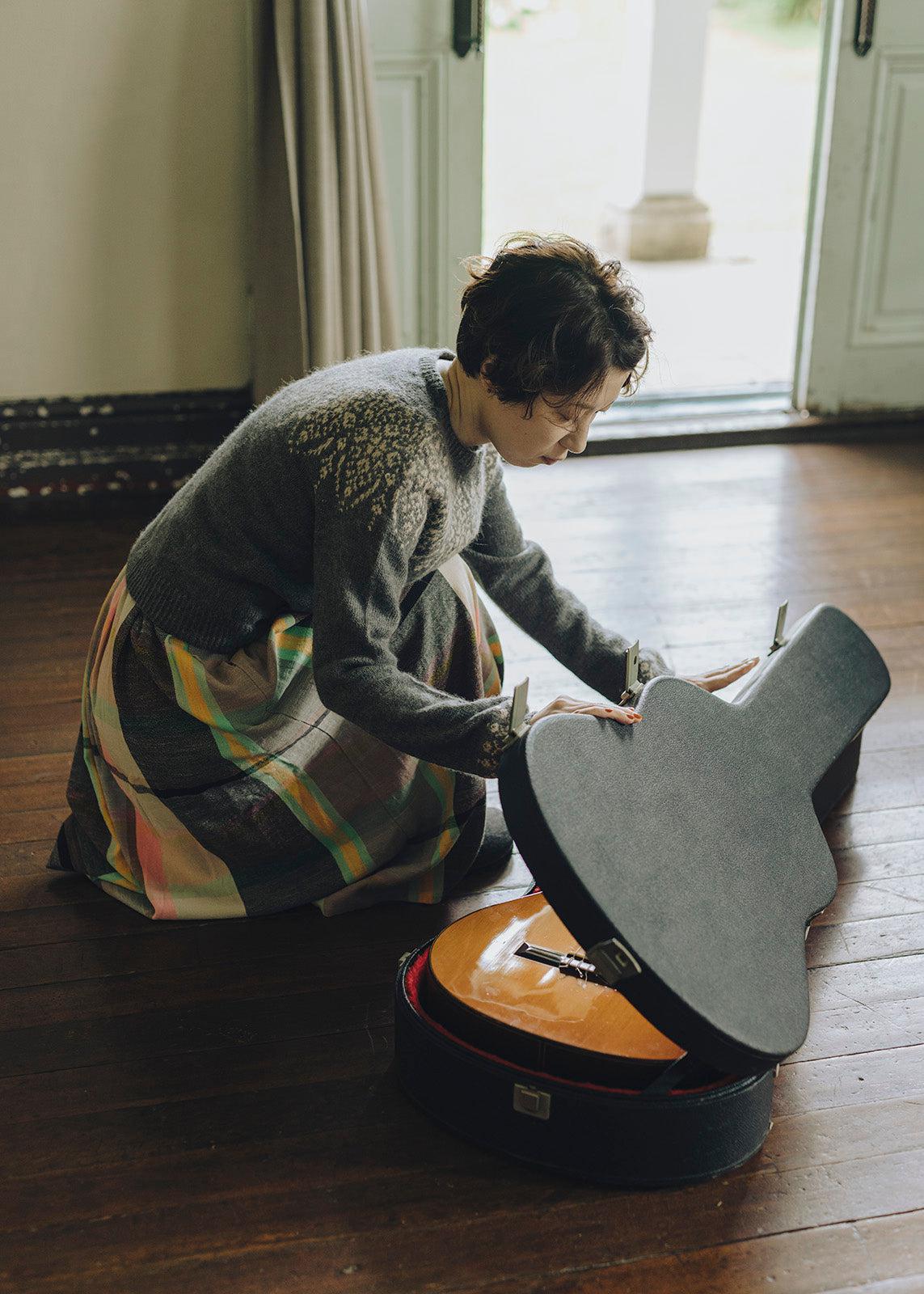 光の帯をまとったような美しいヨークセーター。小さなシンプルな模様を繰り返すことで、宝石の輝きのような瞬間のきらめきのようなモチーフが生み出しています。柔らかなFingeringの糸で編むので、ほわっとした質感が優しく、薄手ながら温かいクラシックな一着です。