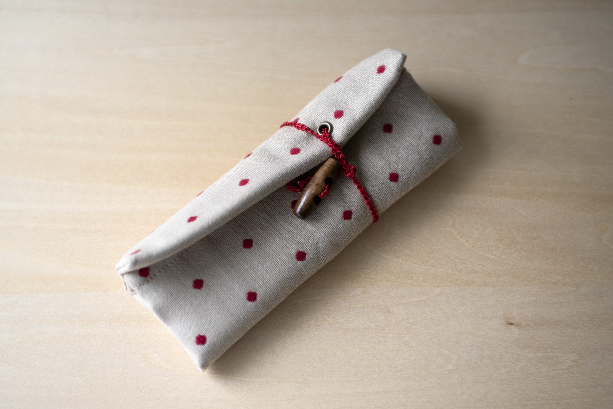 可愛い水玉のケースで、ものさしととじ針が付いている、コンプリートセットです。