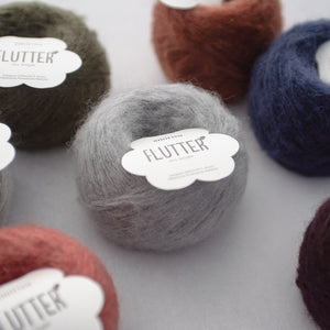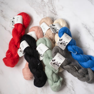 光沢のあるメリノとシルクの芯に、ベビースリアルパカをふんわりと巻き付けています。エアリーですが、太さがあり芯がしっかりしているので編みやすく、上品で落ち着いた雰囲気もあります。