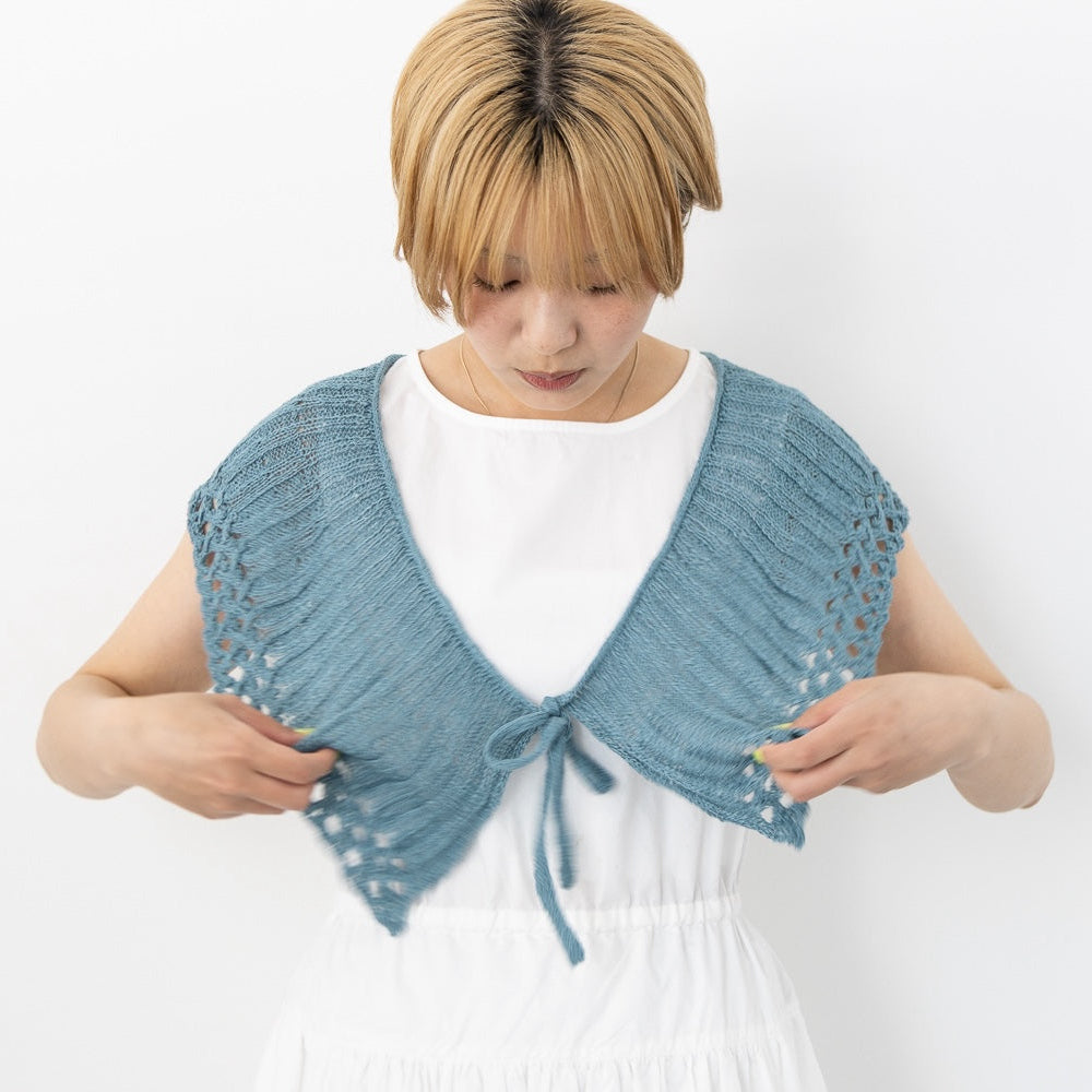ケーブルで作り出す裾のレース模様がクールです。長さがあるので、ショールの気分で肩にかけたり斜めに巻いたり、シンプルになりがちな夏の装いにオシャレ感をプラスしてくれます。