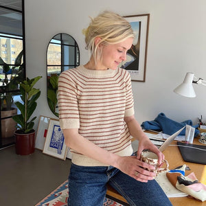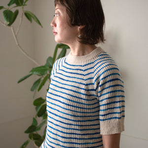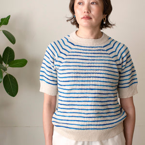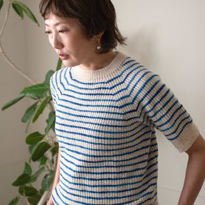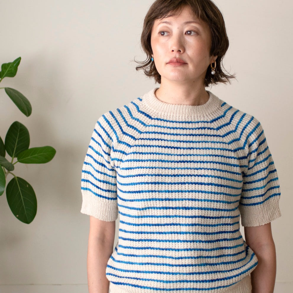 シンプルなボーダーの半袖ニットなのですが、地をポコポコしたブロークンリブで編むので趣きがあります。セミソリッドのSwingのおかげで縞模様に揺らぎが生まれて印象的になって、存在感のある一着になります。