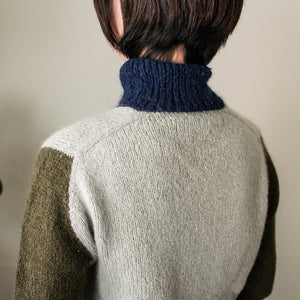 後ろ身頃上部を編み, 肩の目を拾い, 肩を編む. その後、肩の両端に沿って袖の目を拾い, すべてのパーツをつなげ, とじはぎなしのヨークを編み始める. 色替えをした袖にはインターシャの技法を用いる場合, 袖の拾い目から下を配色糸で編む. とじはぎなしのヨークを編んだら, 身頃を編む間, 袖の目を休めておく. それから袖を編む. 襟と前立ての目は後から拾って編む. 襟ぐりはヘンリーネックで, ボタンホールも編む.