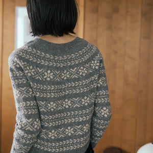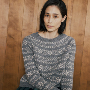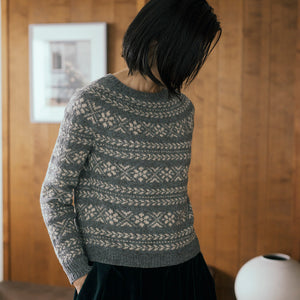 模様が美しい丸ヨークのセーター。全体にあしらわれた幾何学模様は、雪の結晶、雪の花、そして針葉樹の枝を表しているそう。